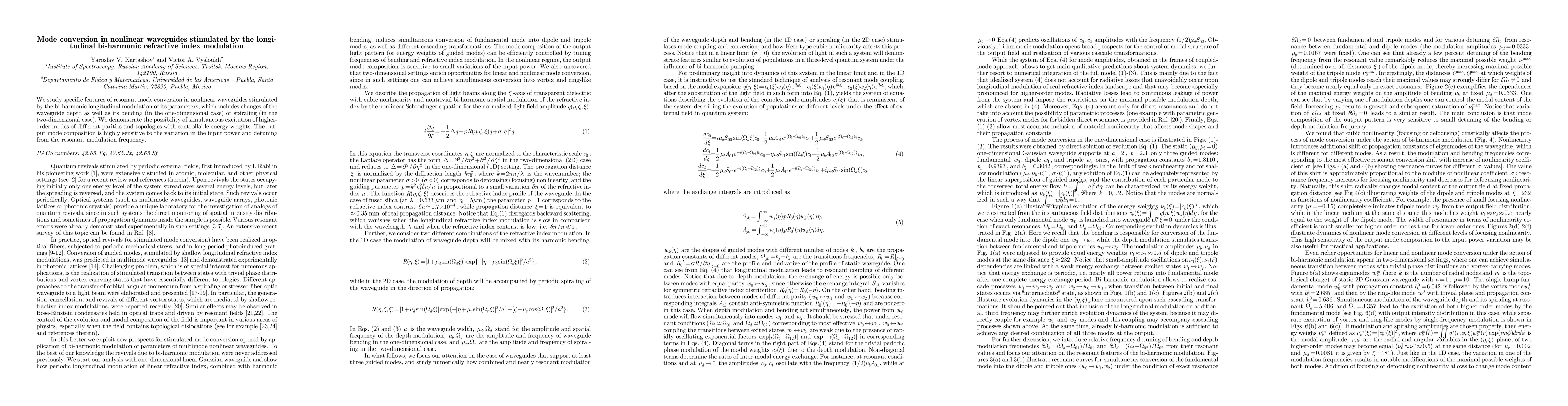 This paper investigates resonant mode conversion in nonlinear waveguides under bi-harmonic longitudinal modulation, including depth changes and bending/spiraling. It demonstrates the controllable excitation of higher-order modes with varying input power and modulation frequency detuning.