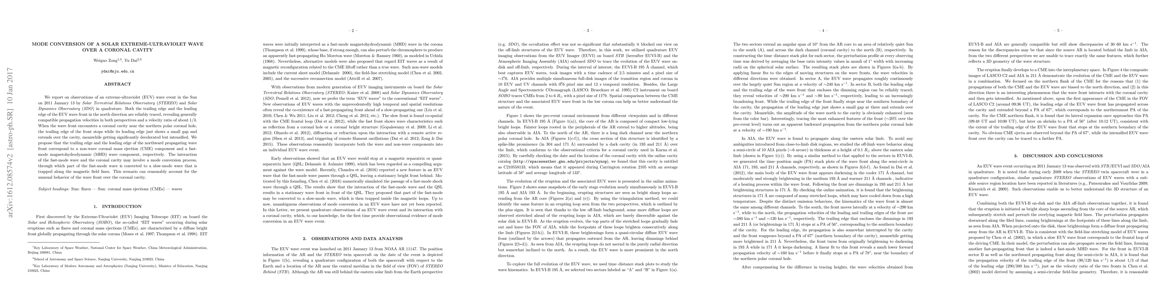 We report on observations of an extreme-ultraviolet (EUV) wave event in the Sun on 2011 January 13 by \emph{Solar Terrestrial Relations Observatory} (\emph{STEREO}) and \emph{Solar Dynamics Observatory} (\emph{SDO}) in quadrature. Both the trailing edge and the leading edge of the EUV wave front in the north direction are reliably traced, revealing generally compatible propagation velocities in both perspectives and a velocity ratio of about 1/3. When the wave front encounters a coronal cavity near the northern polar coronal hole, the trailing edge of the front stops while its leading edge just shows a small gap and extends over the cavity, meanwhile getting significantly decelerated but intensified. We propose that the trailing edge and the leading edge of the northward propagating wave front correspond to a non-wave coronal mass ejection (CME) component and a fast-mode magnetohydrodynamic (MHD) wave component, respectively. The interaction of the fast-mode wave and the coronal cavity may involve a mode conversion process, through which part of the fast-mode wave is converted to a slow-mode wave that is trapped along the magnetic field lines. This scenario can reasonably account for the unusual behavior of the wave front over the coronal cavity.