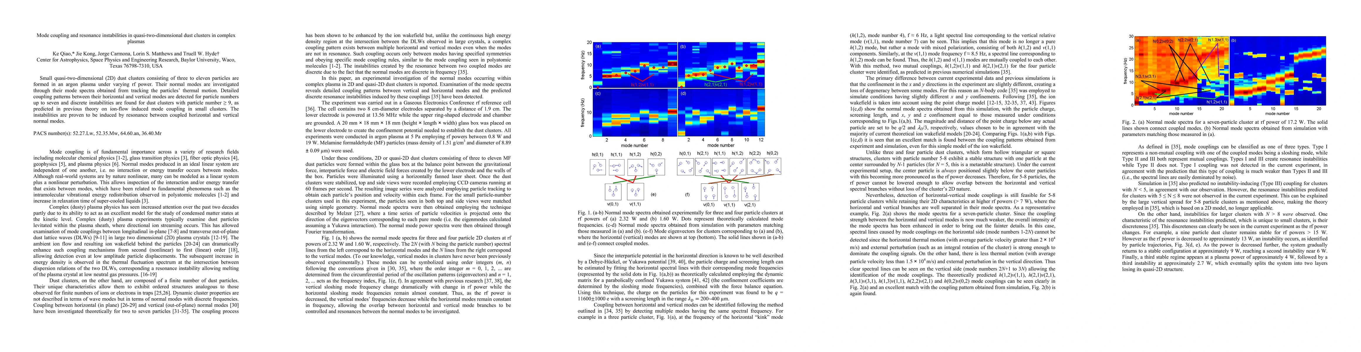 This paper investigates the normal modes of quasi-two-dimensional dust clusters in complex plasmas, revealing detailed coupling patterns and discrete instabilities for clusters with more than nine particles, which are shown to be induced by resonance between coupled horizontal and vertical modes.