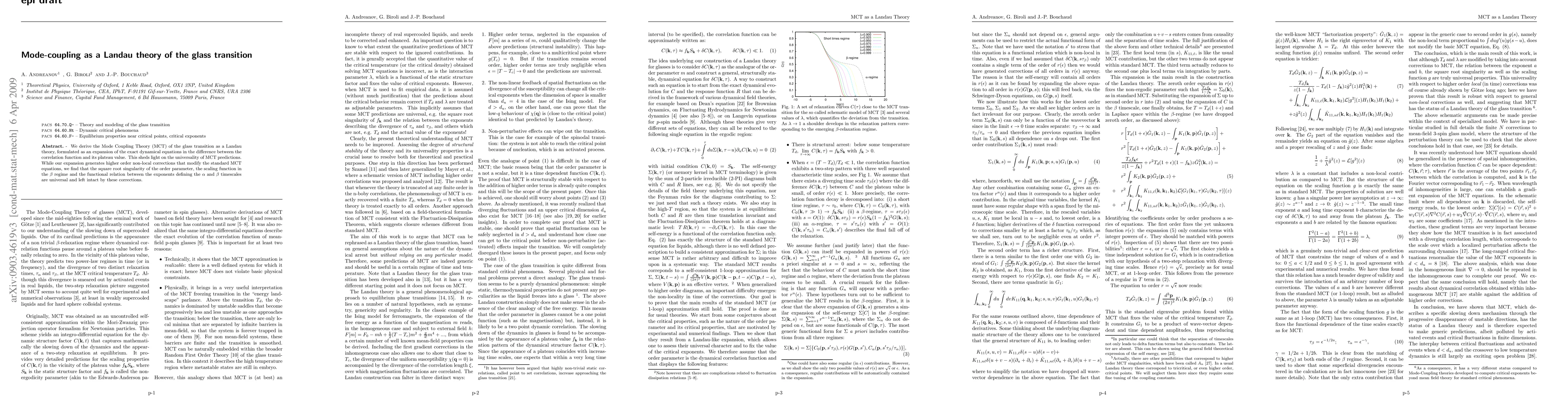 The paper derives Mode Coupling Theory (MCT) as a Landau theory for the glass transition, showing that its key predictions, such as the square root singularity, remain universal despite higher-order corrections. The expansion maintains the fundamental scaling relations and exponents.
