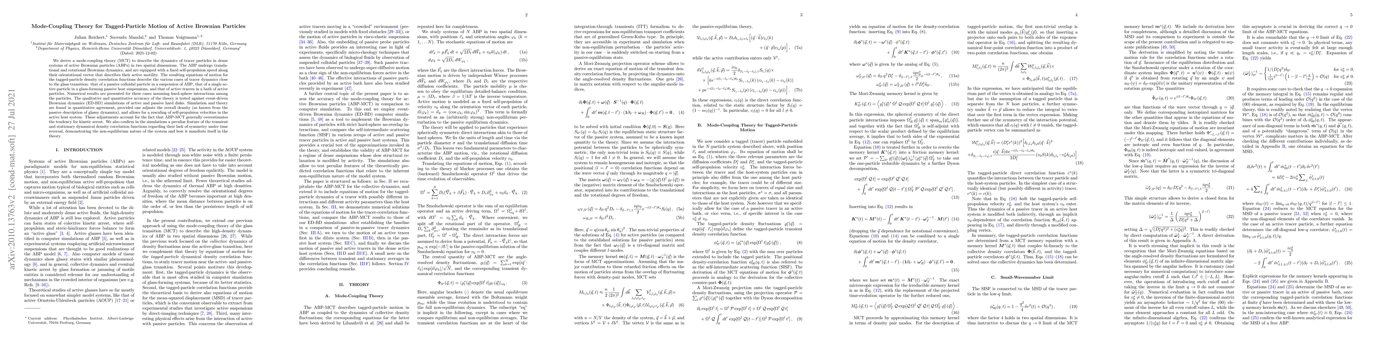 This paper develops a mode-coupling theory (MCT) to analyze the dynamics of tracer particles in dense systems of active Brownian particles (ABPs), showing quantitative agreement with simulations. The theory accounts for the non-equilibrium nature of active systems and predicts asymmetric dynamical density correlation functions.