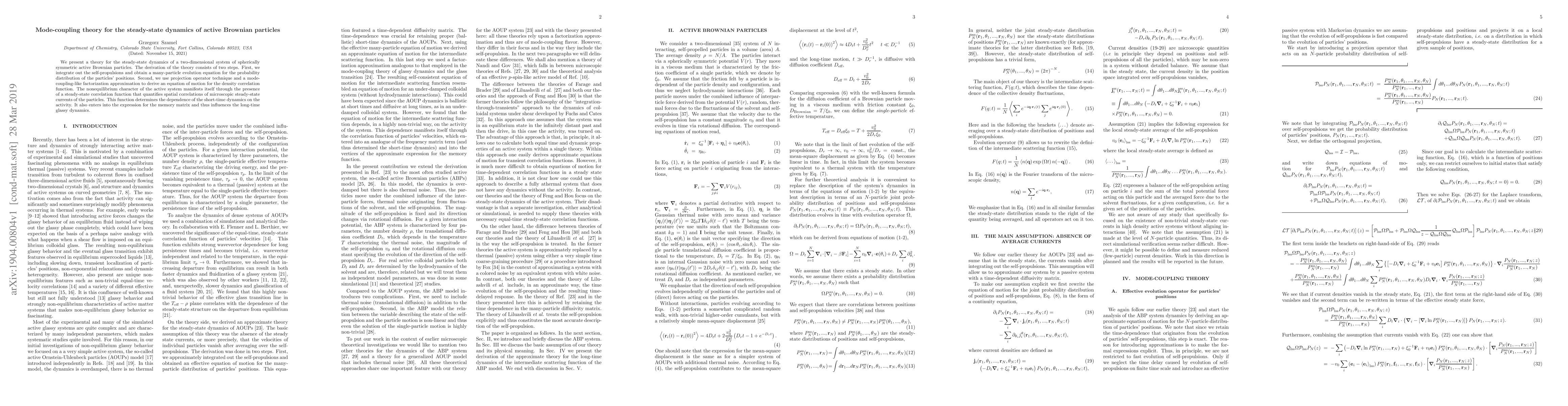 This paper develops a mode-coupling theory for the steady-state dynamics of active Brownian particles, deriving equations for the probability distribution and density correlation function, and highlighting the role of steady-state correlations in both short-time and long-time dynamics.