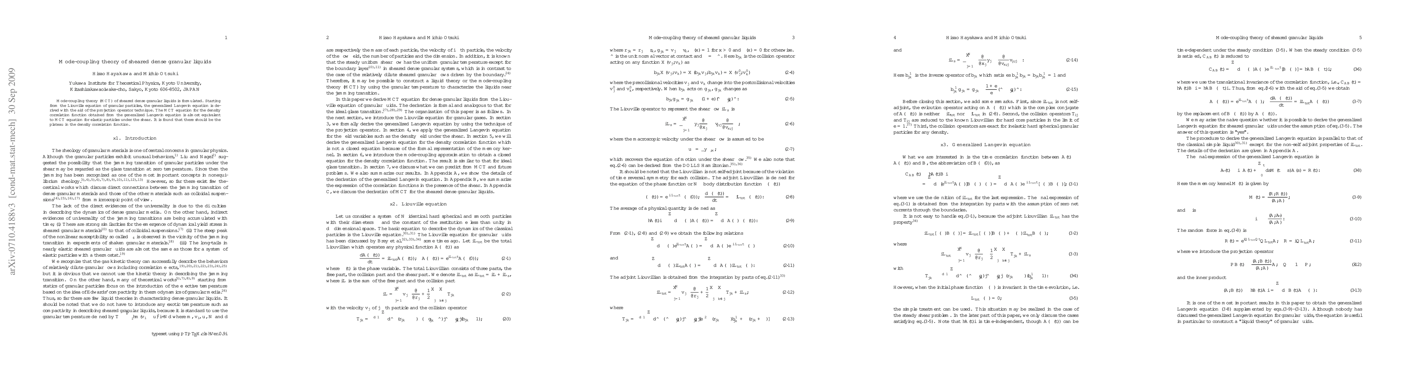This paper formulates mode-coupling theory for sheared dense granular liquids near the jamming transition, deriving a generalized Langevin equation and finding a plateau in the density correlation function, similar to elastic particles under shear.