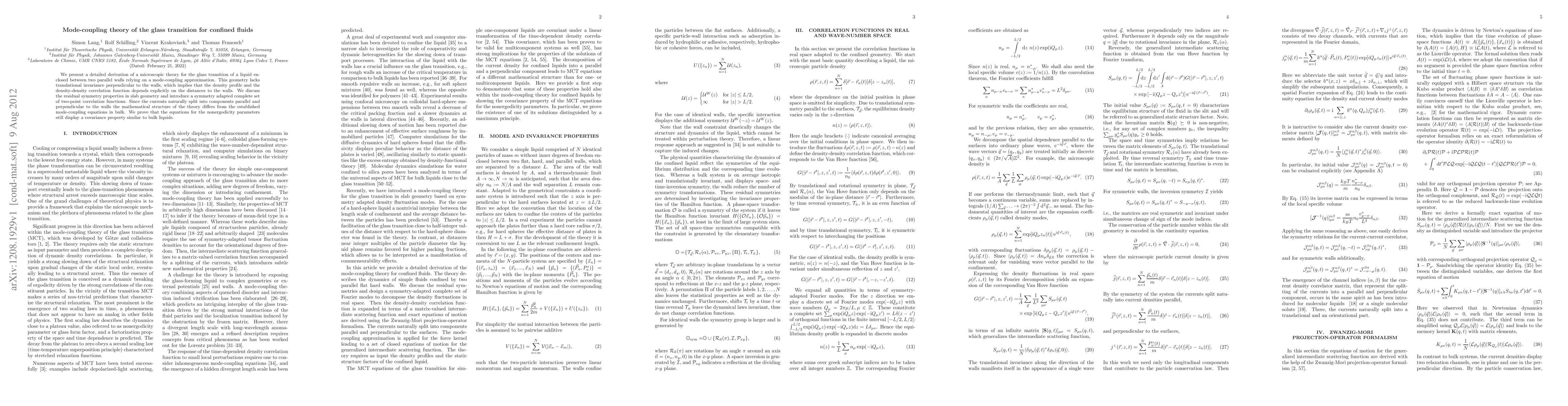 This paper develops a microscopic mode-coupling theory for the glass transition in confined fluids between parallel walls, highlighting the impact of geometry on density profiles and correlation functions. It introduces a symmetry-adapted set of correlation functions and proves that the nonergodicity parameters retain a covariance property akin to bulk liquids.