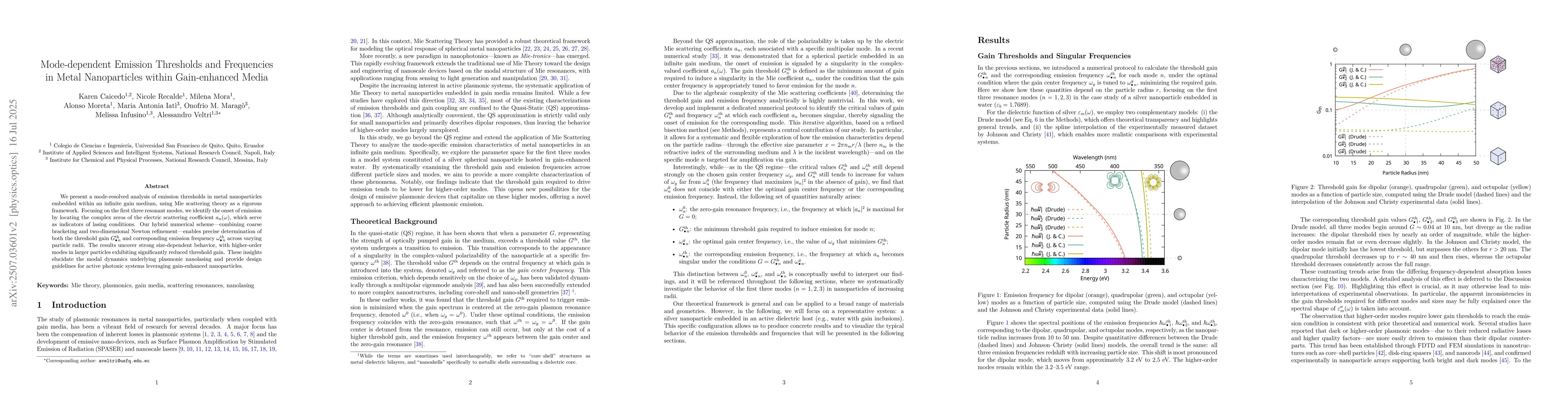 The research employs Mie scattering theory to analyze emission thresholds in metal nanoparticles within a gain-enhanced medium, focusing on the first three resonant modes. A hybrid numerical scheme combining coarse bracketing and two-dimensional Newton refinement is used for precise determination of threshold gain (G_th,n) and corresponding emission frequency (ω_th,n) across varying particle radii.