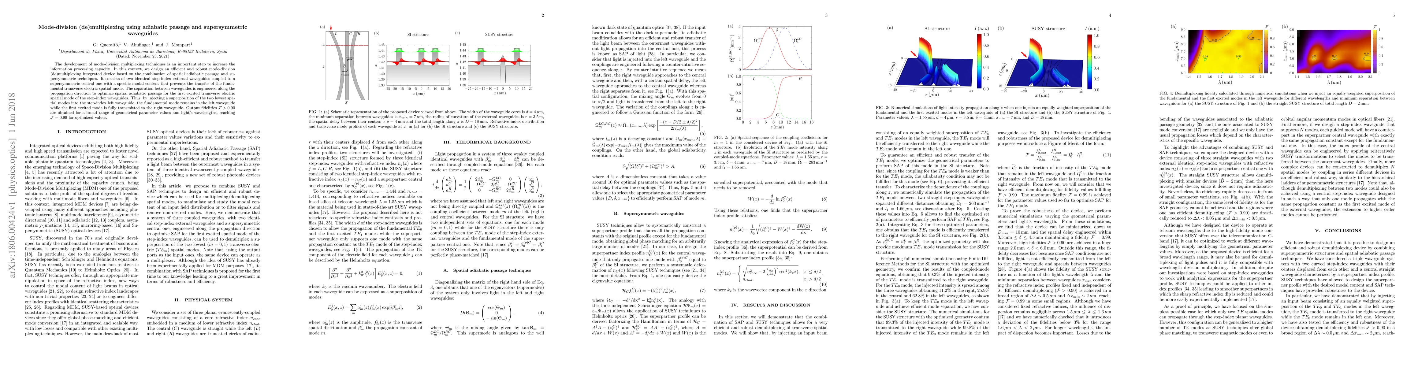 This paper presents an integrated device for mode-division multiplexing using spatial adiabatic passage and supersymmetric waveguides, achieving high fidelity separation of the first excited transverse electric mode from the fundamental mode with output fidelities exceeding 0.90, and up to 0.99 under optimal conditions.