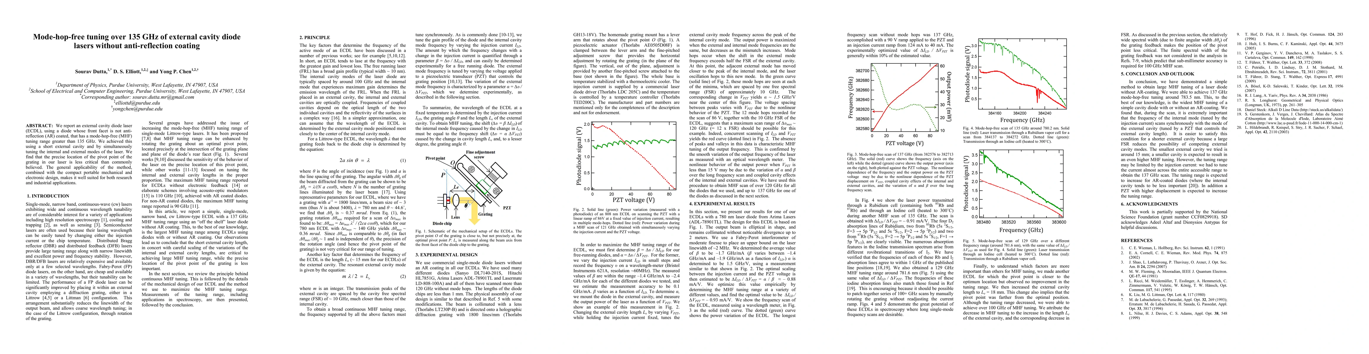 This paper presents an external cavity diode laser (ECDL) with a mode-hop-free tuning range exceeding 135 GHz, achieved without using an anti-reflection coated diode front facet. The method's success hinges on a short external cavity and simultaneous internal and external mode tuning, demonstrating the technique's broad applicability and suitability for research and industrial uses.