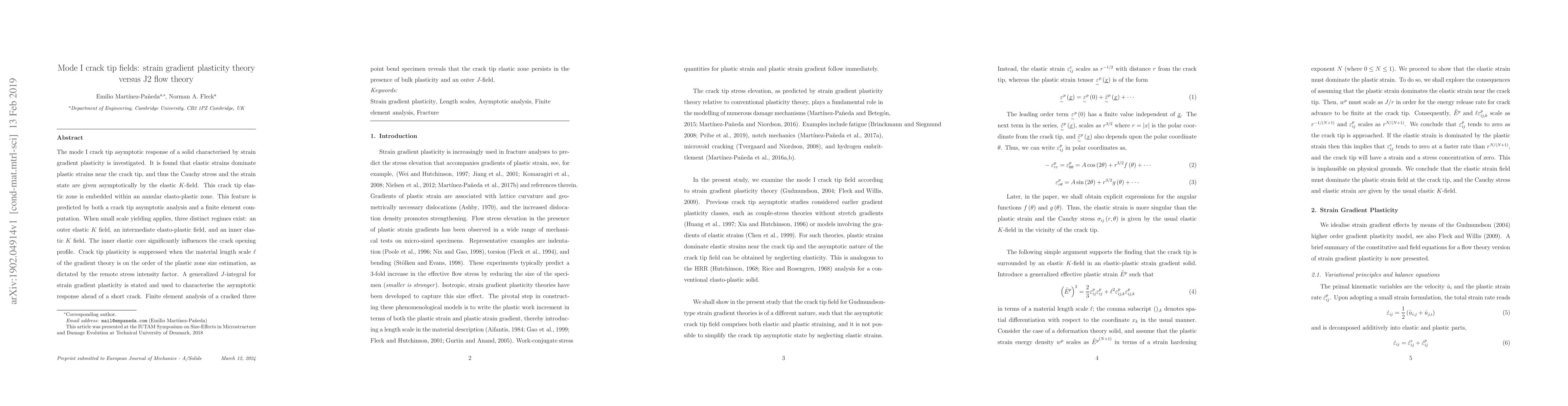 This paper investigates the mode I crack tip fields in a material characterized by strain gradient plasticity, finding that elastic strains dominate near the crack tip, leading to an inner elastic core that significantly influences the crack opening profile. The study compares strain gradient plasticity theory with traditional J2 flow theory, revealing three distinct regimes under small scale yielding conditions.