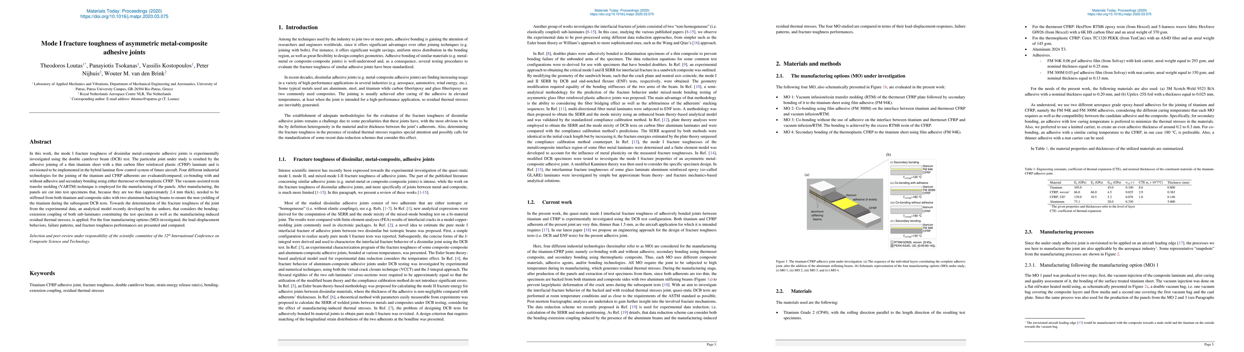 In this work, the mode I fracture toughness of dissimilar metal-composite adhesive joints is experimentally investigated using the double cantilever beam (DCB) test. The particular joint under study is resulted by the adhesive joining of a thin titanium sheet with a thin carbon fiber reinforced plastic (CFRP) laminate and is envisioned to be implemented in the hybrid laminar flow control system of future aircraft. Four different industrial technologies for the joining of the titanium and CFRP adherents are evaluated/compared; co-bonding with and without adhesive and secondary bonding using either thermoset or thermoplastic CFRP. The vacuum-assisted resin transfer molding (VARTM) technique is employed for the manufacturing of the panels. After manufacturing, the panels are cut into test specimens that, because they are too thin (approximately 2.4 mm thick), needed to be stiffened from both titanium and composite sides with two aluminum backing beams to ensure the non-yielding of the titanium during the subsequent DCB tests. Towards the determination of the fracture toughness of the joint from the experimental data, an analytical model recently developed by the authors, that considers the bending-extension coupling of both sub-laminates constituting the test specimen as well as the manufacturing-induced residual thermal stresses, is applied. For the four manufacturing options (MO) investigated, the load-displacement behaviors, failure patterns, and fracture toughness performances are presented and compared.