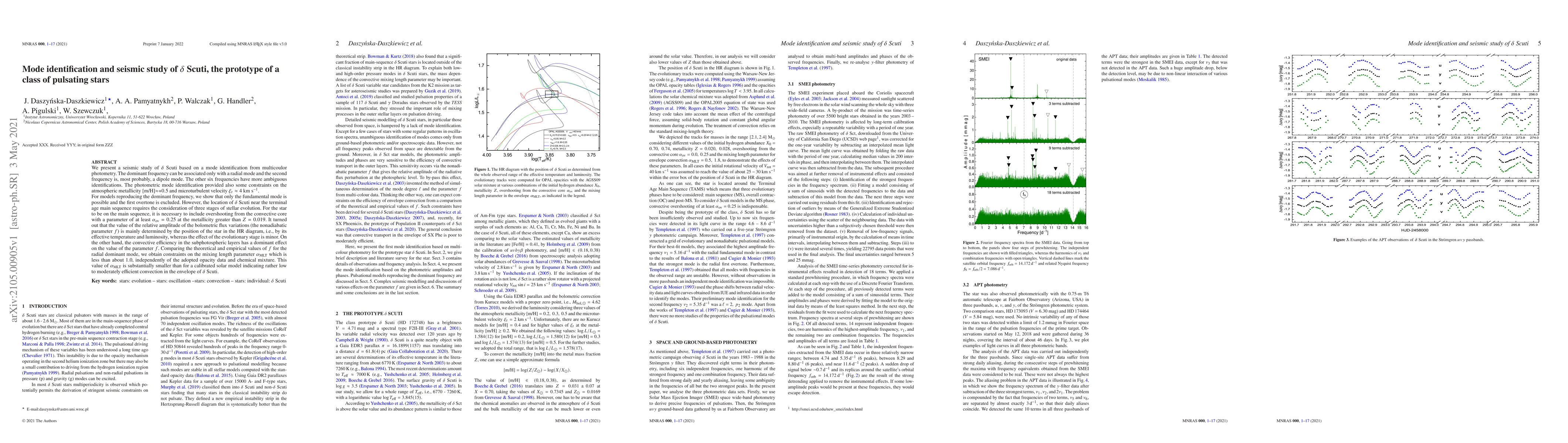 This paper conducts a seismic study of the $\delta$ Scuti star using multicolor photometry to identify pulsation modes, finding a dominant radial mode and a probable dipole mode. It also discusses the star's atmospheric metallicity and microturbulent velocity, and concludes that the star's evolution requires overshooting from the convective core, with the nonadiabatic parameter $f$ primarily determined by its position in the HR diagram.