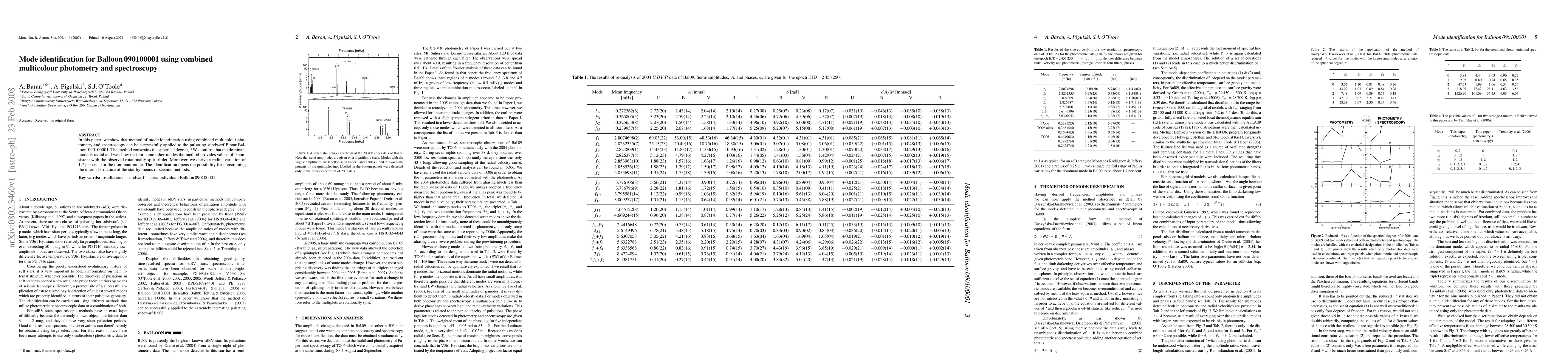In this paper, we show that method of mode identification using combined multicolour photometry and spectroscopy can be successfully applied to the pulsating subdwarf B star Balloon 090100001. The method constrains the spherical degree, l.We confirm that the dominant mode is radial and we show that for some other modes the method provides values of l consistent with the observed rotationally split triplet. Moreover, we derive a radius variation of 1.7 per cent for the dominant mode. The identification opens the possibility for constraining the internal structure of the star by means of seismic methods.