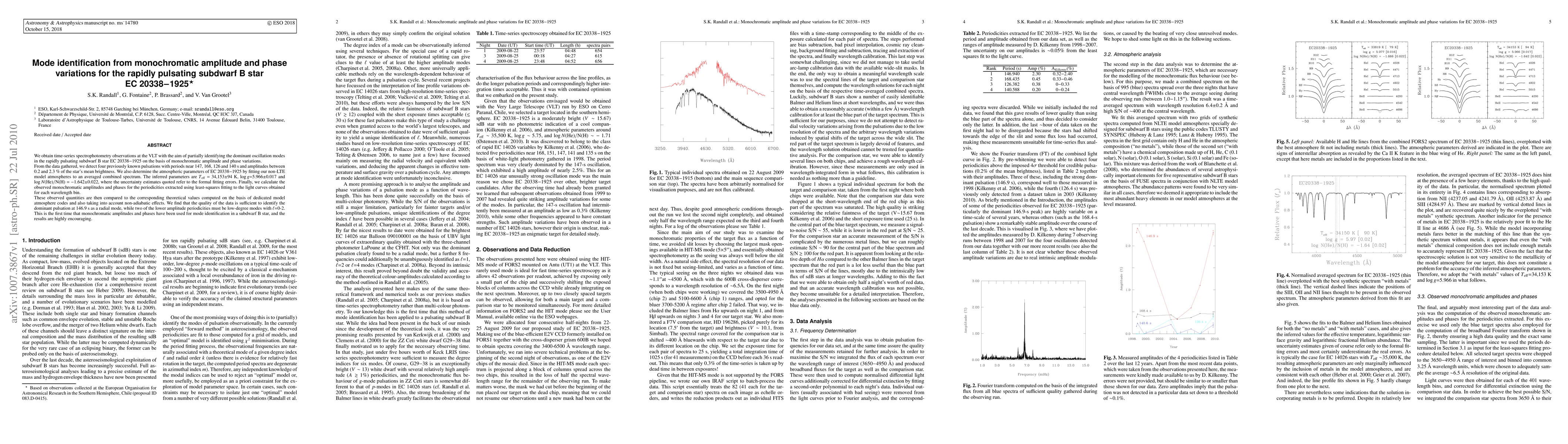 Researchers used spectrophotometry observations to identify pulsation modes in a rapidly pulsating subdwarf B star, detecting four known periodicities with radial mode at 146.9 s.