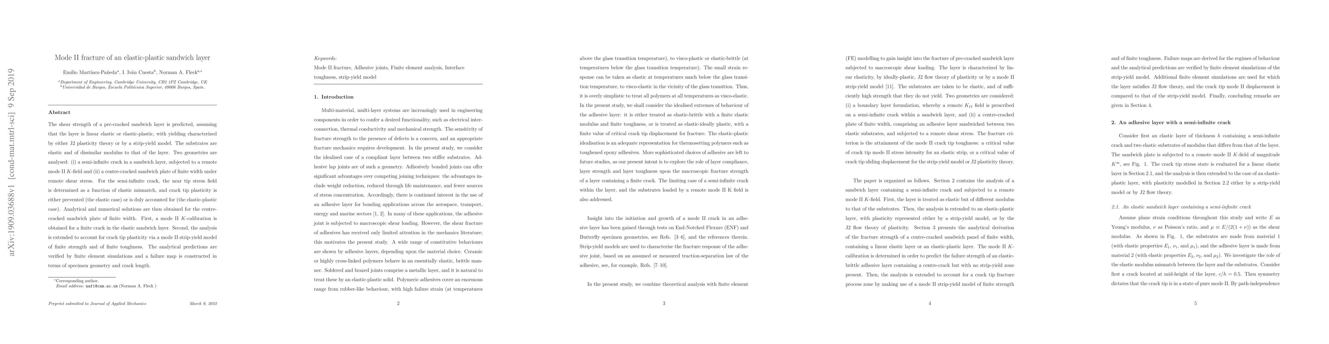 The shear strength of a pre-cracked sandwich layer is predicted, assuming that the layer is linear elastic or elastic-plastic, with yielding characterized by either J2 plasticity theory or by a strip-yield model. The substrates are elastic and of dissimilar modulus to that of the layer. Two geometries are analysed: (i) a semi-infinite crack in a sandwich layer, subjected to a remote mode II K-field and (ii) a centre-cracked sandwich plate of finite width under remote shear stress. For the semi-infinite crack, the near tip stress field is determined as a function of elastic mismatch, and crack tip plasticity is either prevented (the elastic case) or is duly accounted for (the elastic-plastic case). Analytical and numerical solutions are then obtained for the centre-cracked sandwich plate of finite width. First, a mode II K-calibration is obtained for a finite crack in the elastic sandwich layer. Second, the analysis is extended to account for crack tip plasticity via a mode II strip-yield model of finite strength and of finite toughness. The analytical predictions are verified by finite element simulations and a failure map is constructed in terms of specimen geometry and crack length.