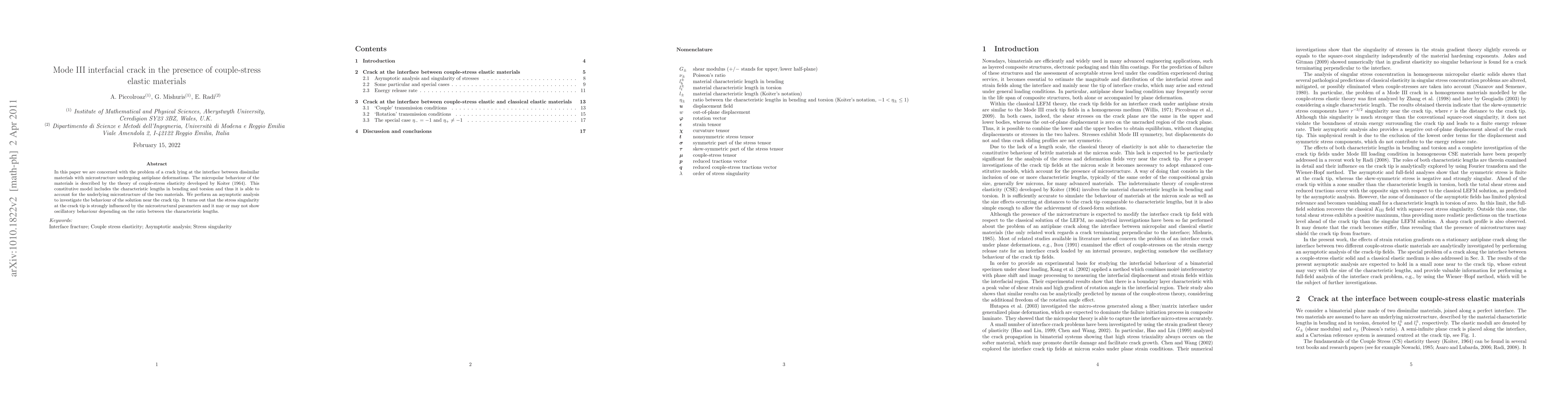 This paper examines a Mode III interfacial crack in couple stress elastic materials, employing Koiter's theory of couple stress elasticity to account for microstructural effects. An asymptotic analysis reveals that microstructural parameters significantly influence the stress singularity near the crack tip, potentially leading to oscillatory behaviour.