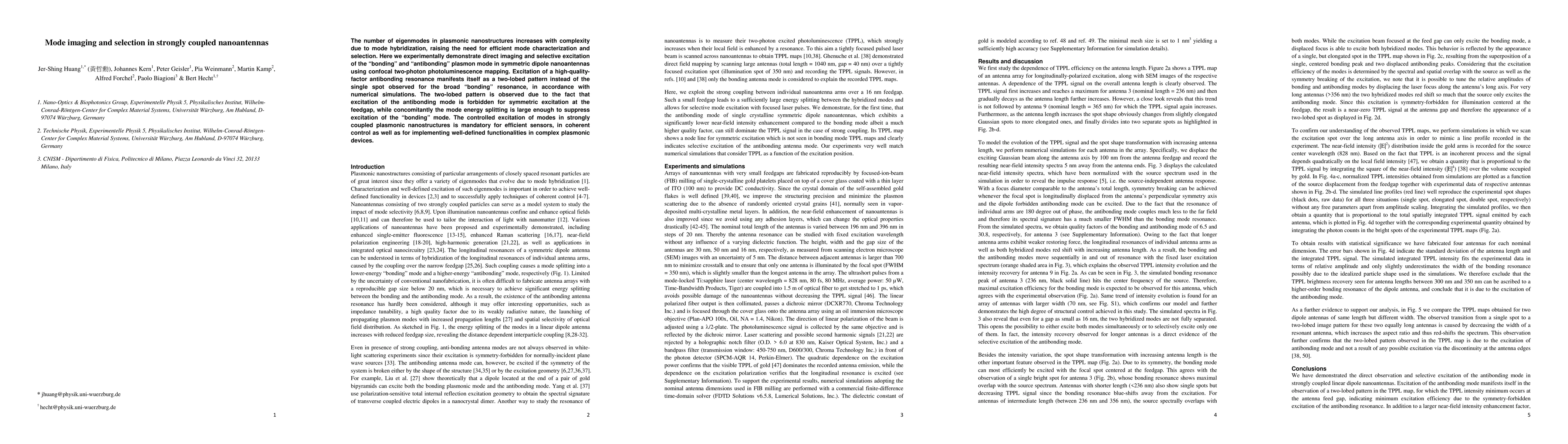 The number of eigenmodes in plasmonic nanostructures increases with complexity due to mode hybridization, raising the need for efficient mode characterization and selection. Here we experimentally demonstrate direct imaging and selective excitation of the bonding and antibonding plasmon mode in symmetric dipole nanoantennas using confocal two-photon photoluminescence mapping. Excitation of a high-quality-factor antibonding resonance manifests itself as a two-lobed pattern instead of the single spot observed for the broad bonding resonance, in accordance with numerical simulations. The two-lobed pattern is observed due to the fact that excitation of the antibonding mode is forbidden for symmetric excitation at the feedgap, while concomitantly the mode energy splitting is large enough to suppress excitation of the bonding mode. The controlled excitation of modes in strongly coupled plasmonic nanostructures is mandatory for efficient sensors, in coherent control as well as for implementing well-defined functionalities in complex plasmonic devices.