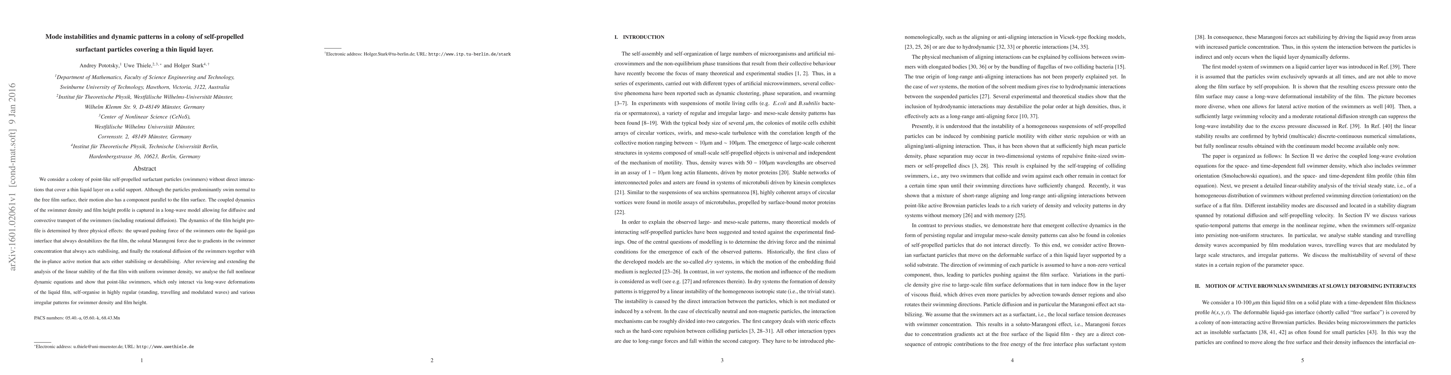 This paper investigates the dynamics of self-propelled surfactant particles covering a thin liquid layer, focusing on the instabilities and patterns formed due to the interplay between swimmer density and film height. It reveals that these particles can self-organize into regular and irregular dynamic patterns, influenced by swimmer-induced film deformations and Marangoni effects.