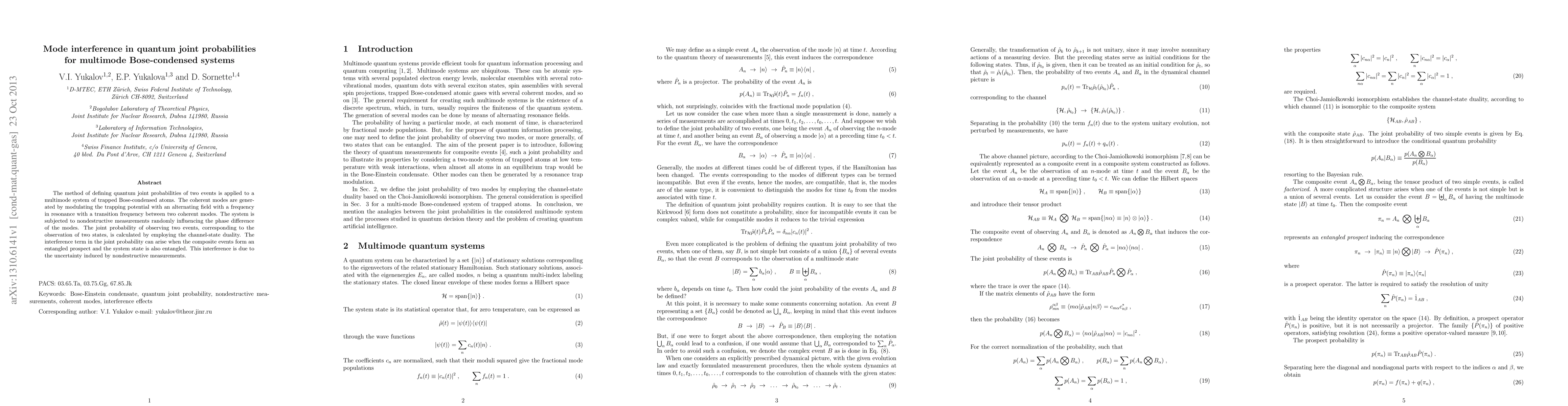 The method of defining quantum joint probabilities of two events is applied to a multimode system of trapped Bose-condensed atoms. The coherent modes are generated by modulating the trapping potential with an alternating field with a frequency in resonance with a transition frequency between two coherent modes. The system is subjected to nondestructive measurements randomly influencing the phase difference of the modes. The joint probability of observing two events, corresponding to the observation of two states, is calculated by employing the channel-state duality. The interference term in the joint probability can arise when the composite events form an entangled prospect and the system state is also entangled. This interference is due to the uncertainty induced by nondestructive measurements.