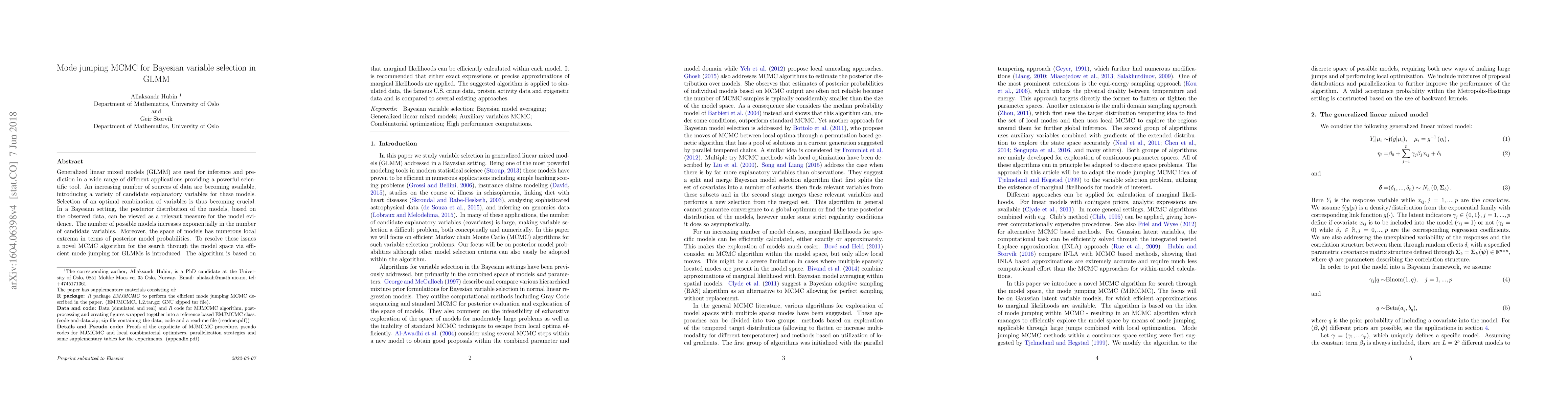Generalized linear mixed models (GLMM) are used for inference and prediction in a wide range of different applications providing a powerful scientific tool. An increasing number of sources of data are becoming available, introducing a variety of candidate explanatory variables for these models. Selection of an optimal combination of variables is thus becoming crucial. In a Bayesian setting, the posterior distribution of the models, based on the observed data, can be viewed as a relevant measure for the model evidence. The number of possible models increases exponentially in the number of candidate variables. Moreover, the space of models has numerous local extrema in terms of posterior model probabilities. To resolve these issues a novel MCMC algorithm for the search through the model space via efficient mode jumping for GLMMs is introduced. The algorithm is based on that marginal likelihoods can be efficiently calculated within each model. It is recommended that either exact expressions or precise approximations of marginal likelihoods are applied. The suggested algorithm is applied to simulated data, the famous U.S. crime data, protein activity data and epigenetic data and is compared to several existing approaches.