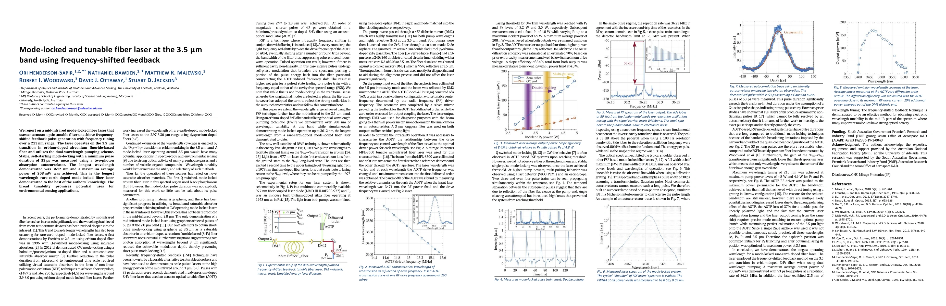 This research presents a mid-infrared mode-locked fiber laser with tunable frequency-shifted feedback, operating at the 3.5 μm erbium-doped zirconium fluoride fiber transition. The laser achieves stable mode-locking and self-starting operation, demonstrating a minimum pulse duration of 53 ps and a broad tuning range of 215 nm.