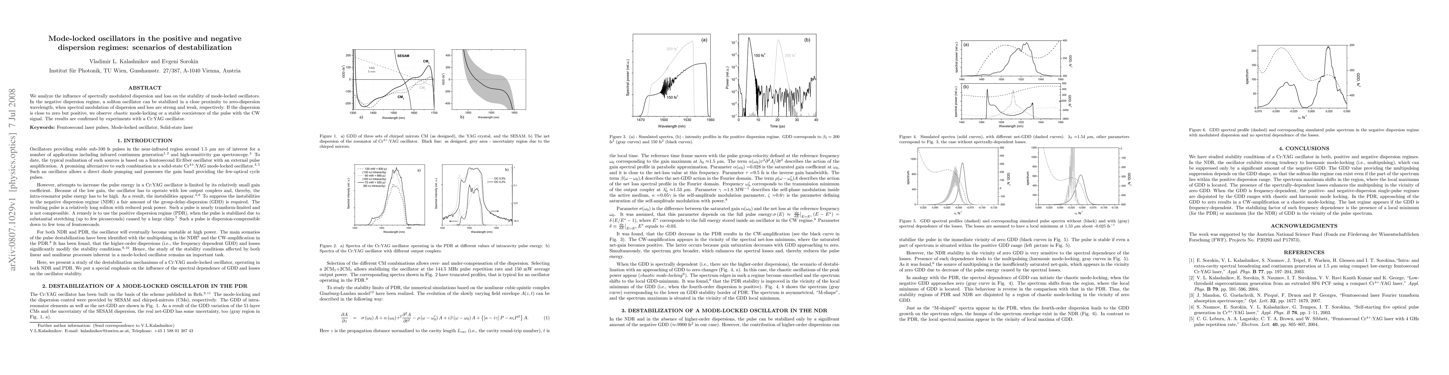 We analyze the influence of spectrally modulated dispersion and loss on the stability of mode-locked oscillators. In the negative dispersion regime, a soliton oscillator can be stabilized in a close proximity to zero-dispersion wavelength, when spectral modulation of dispersion and loss are strong and weak, respectively. If the dispersion is close to zero but positive, we observe chaotic mode-locking or a stable coexistence of the pulse with the CW signal. The results are confirmed by experiments with a Cr:YAG oscillator.