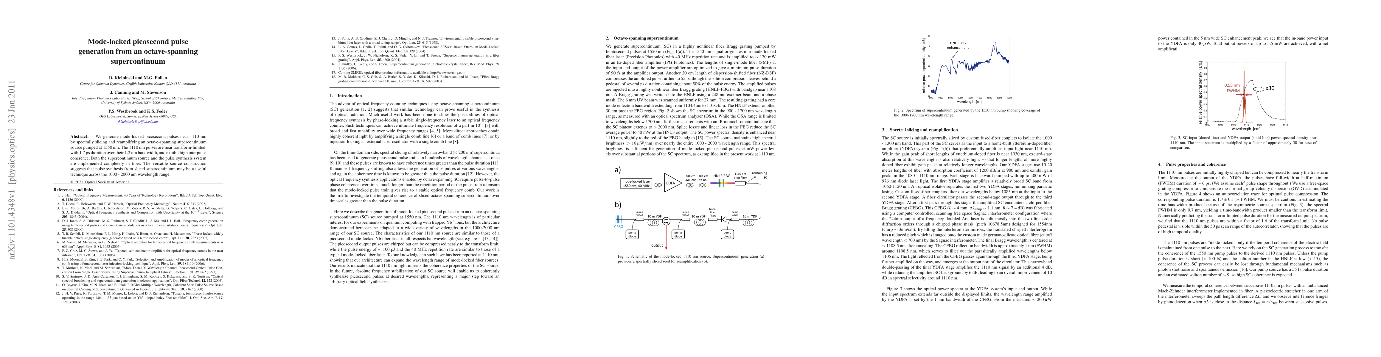 This paper reports the generation of mode-locked picosecond pulses near 1110 nm using a spectrally sliced and reamplified octave-spanning supercontinuum source pumped at 1550 nm. The pulses exhibit near transform-limited characteristics with a 1.7 ps duration and high interpulse coherence, demonstrating a versatile fiber-based source technique applicable across the 1000 - 2000 nm range.