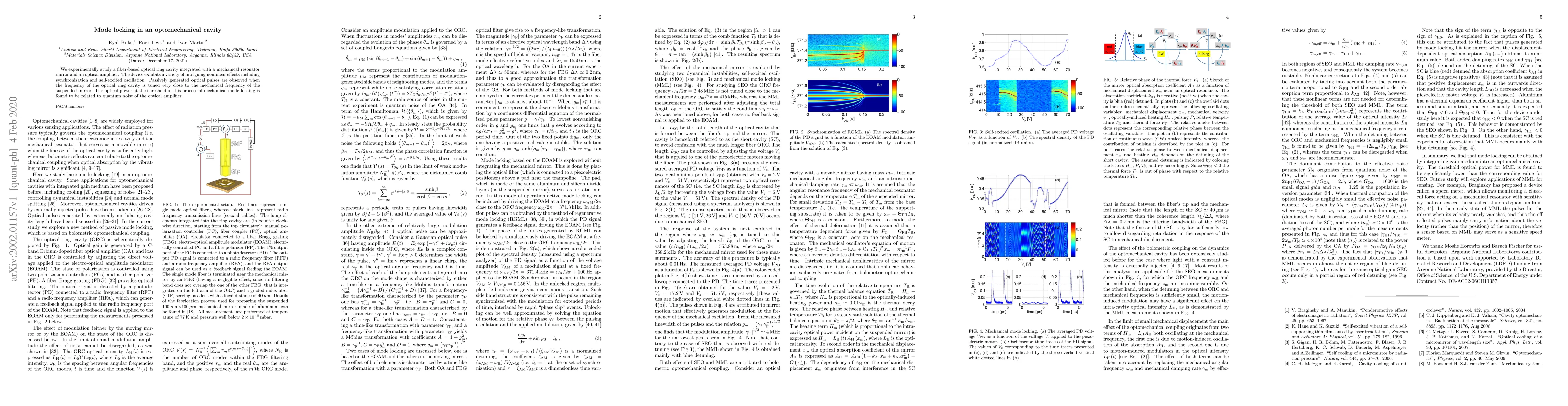 We experimentally study a fiber-based optical ring cavity integrated with a mechanical resonator mirror and an optical amplifier. The device exhibits a variety of intriguing nonlinear effects including synchronization and self-excited oscillation. Passively generated optical pulses are observed when the frequency of the optical ring cavity is tuned very close to the mechanical frequency of the suspended mirror. The optical power at the threshold of this process of mechanical mode locking is found to be related to quantum noise of the optical amplifier.
