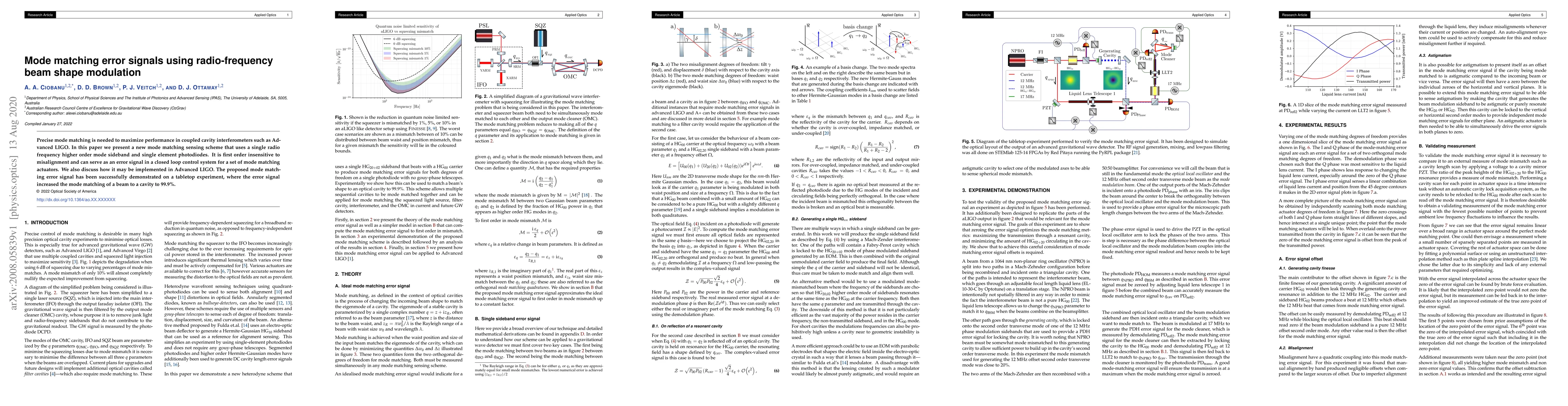 Precise mode matching is needed to maximize performance in coupled cavity interferometers such as Advanced LIGO. In this paper we present a new mode matching sensing scheme that uses a single radio frequency higher order mode sideband and single element photodiodes. It is first order insensitive to misalignment and can serve as an error signal in a closed loop control system for a set of mode matching actuators. We also discuss how it may be implemented in Advanced LIGO. The proposed mode matching error signal has been successfully demonstrated on a tabletop experiment, where the error signal increased the mode matching of a beam to a cavity to 99.9%.