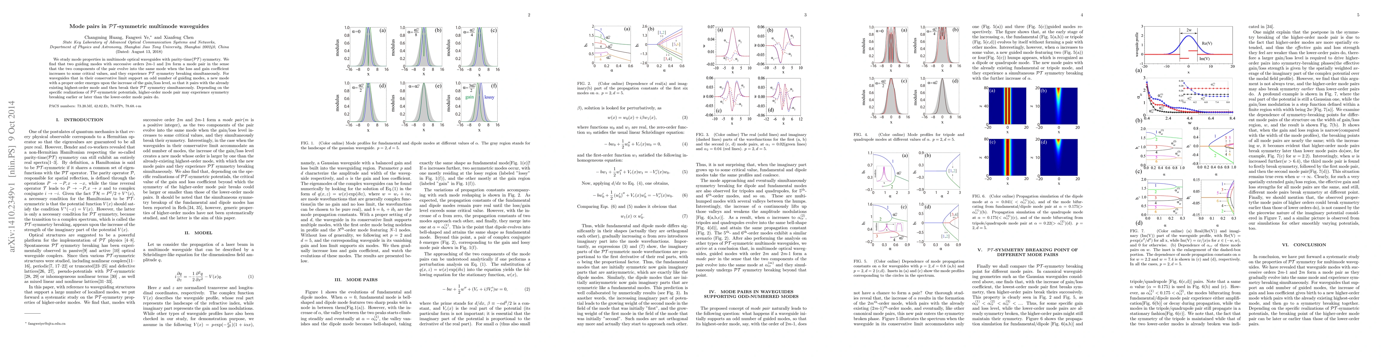 This paper investigates mode pairs in $\mathcal{PT}$-symmetric multimode waveguides, discovering that modes with consecutive orders evolve into a single mode under critical loss/gain conditions, exhibiting $\mathcal{PT}$ symmetry breaking. An additional mode forms and pairs with the highest-order mode in conservative waveguides, also undergoing symmetry breaking.