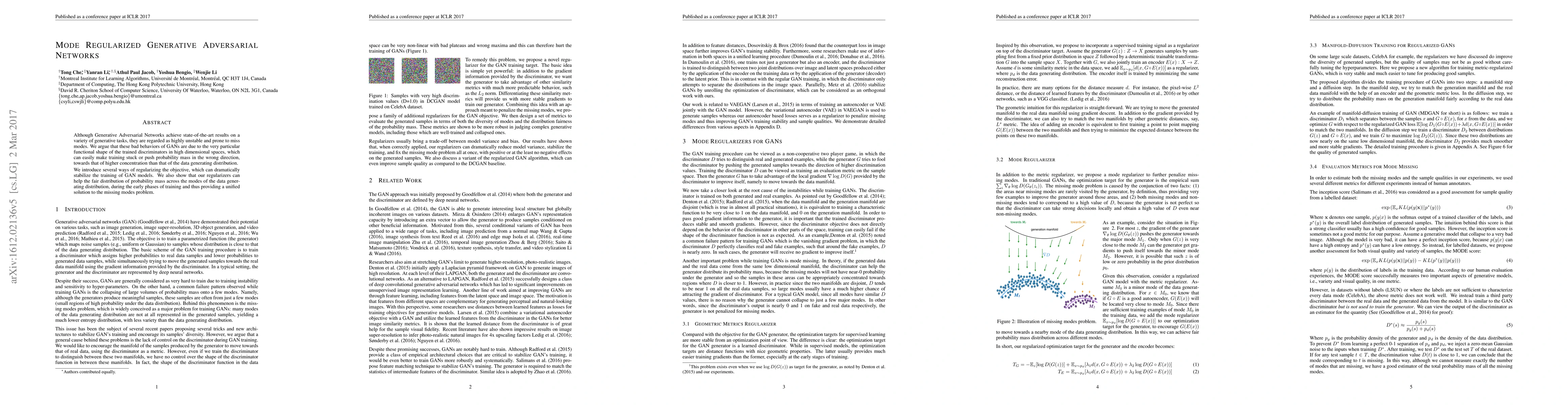 This paper introduces methods to stabilize Generative Adversarial Networks (GANs) by regularizing their training, helping them produce fair probability distributions across multiple modes of the data generating distribution.
