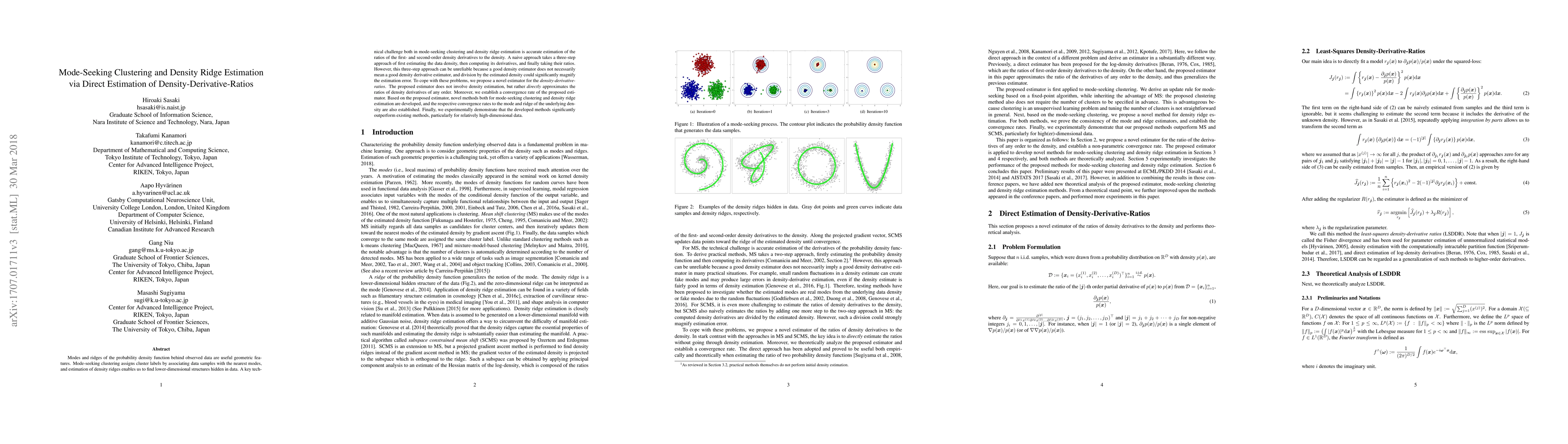 This paper proposes a novel method for mode-seeking clustering and density ridge estimation by directly estimating density-derivative-ratios without intermediate density estimation. The proposed direct estimator improves accuracy and convergence rates, leading to superior performance in clustering and ridge detection, especially in high-dimensional data.