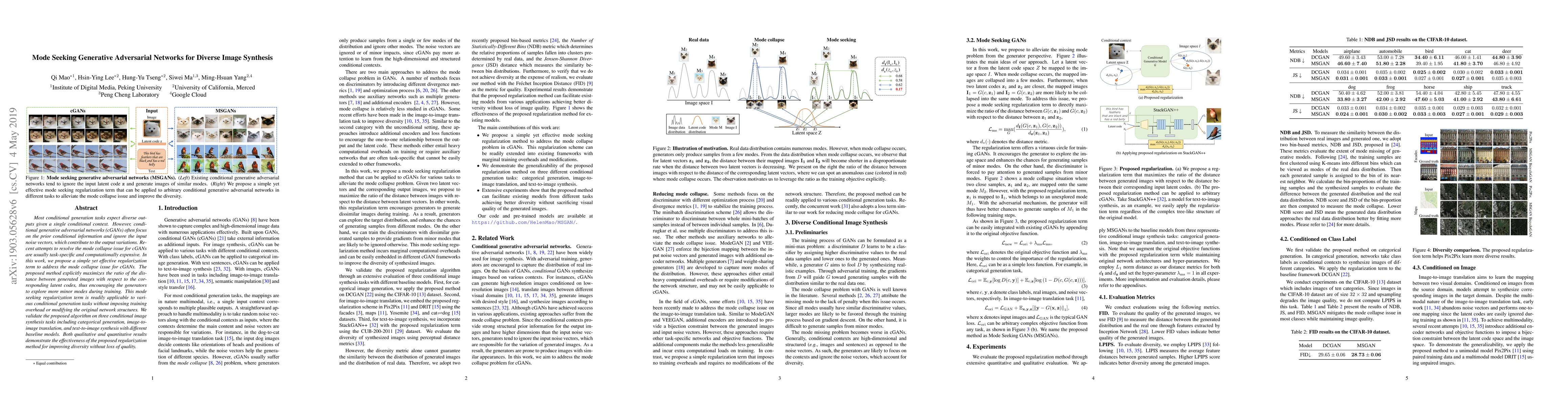This paper proposes a mode seeking regularization term for conditional GANs to improve diversity in generated images without compromising quality. The method encourages the generator to explore minor modes by maximizing the distance between generated images and their latent codes, applicable to various tasks without additional training overhead.