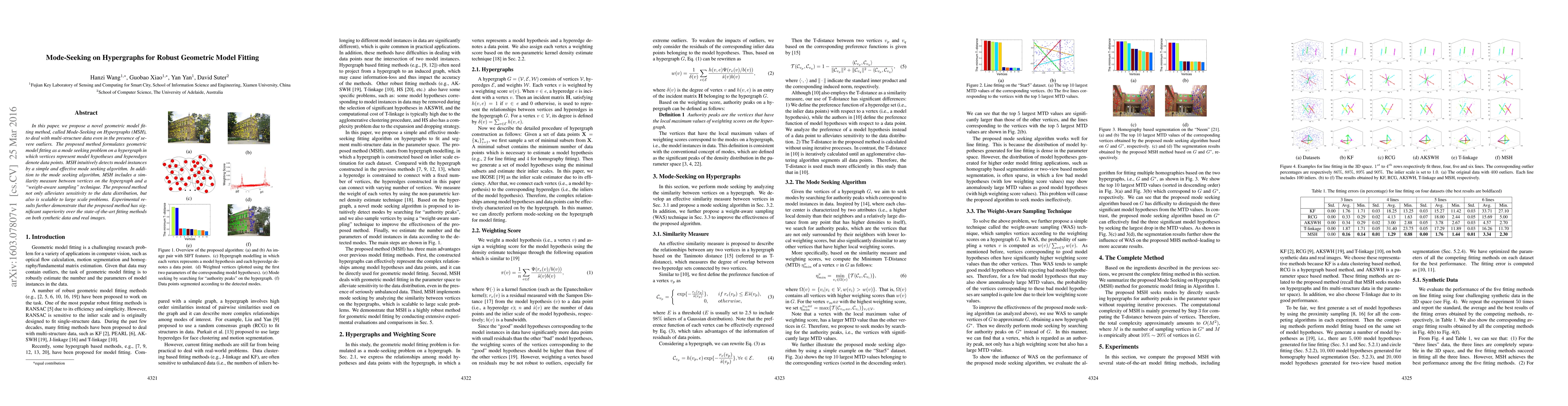 A new method called Mode-Seeking on Hypergraphs (MSH) is proposed for robust geometric model fitting, which can handle multi-structure data with severe outliers and outperforms state-of-the-art methods.
