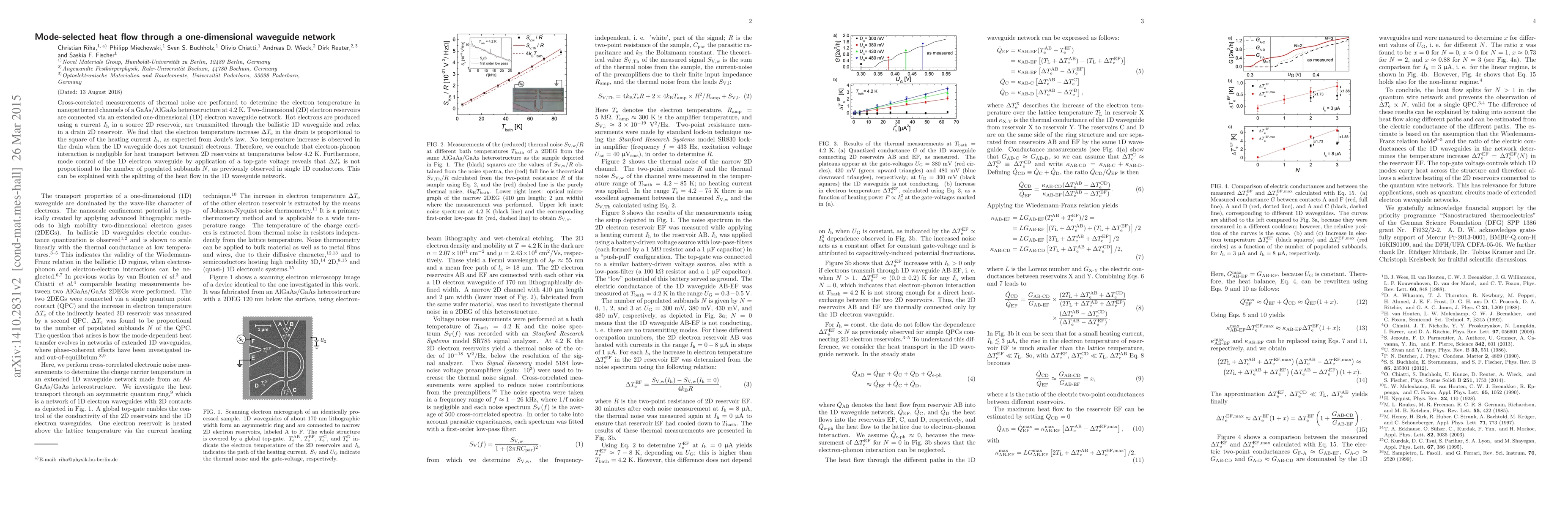 This study investigates electron temperature in nanopatterned GaAs/AlGaAs channels using thermal noise measurements, finding that heat transport is unaffected by electron-phonon interactions below 4.2 K. Mode control via a top-gate voltage shows that heat flow splitting in a 1D waveguide network alters the expected relationship between temperature increase and subband occupation.