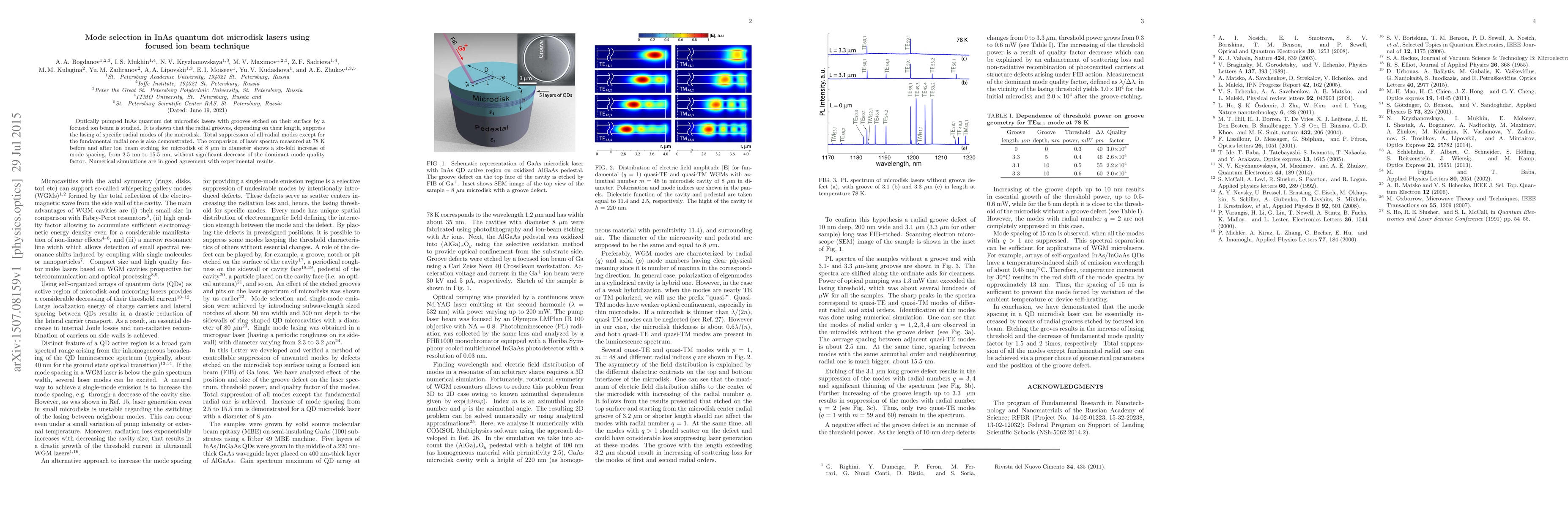 This study investigates InAs quantum dot microdisk lasers with surface grooves etched by focused ion beam, demonstrating that radial grooves can selectively suppress specific radial modes, leading to a six-fold increase in mode spacing and maintaining the quality factor of the dominant mode. Numerical simulations corroborate the experimental findings.
