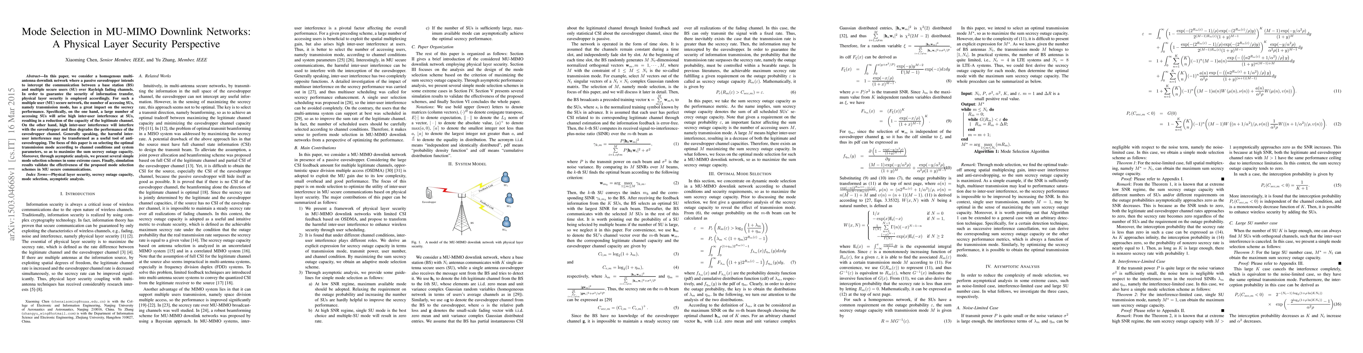 This paper investigates optimal mode selection in multi-antenna downlink networks to maximize sum secrecy outage capacity, balancing inter-user interference for legitimate channels and eavesdropping channels. Simple mode selection schemes are proposed and validated through simulations for secure MU-MIMO communications.