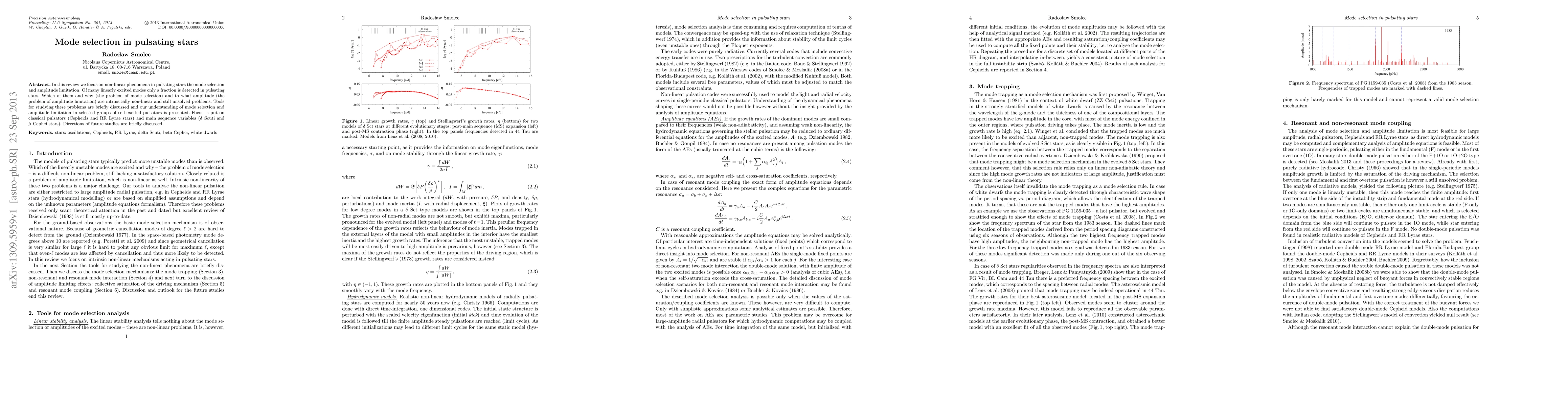 The paper presents a detailed review of mode selection and amplitude limitation in pulsating stars, discussing various theoretical approaches, computational methods, and their applications to specific groups of pulsators.