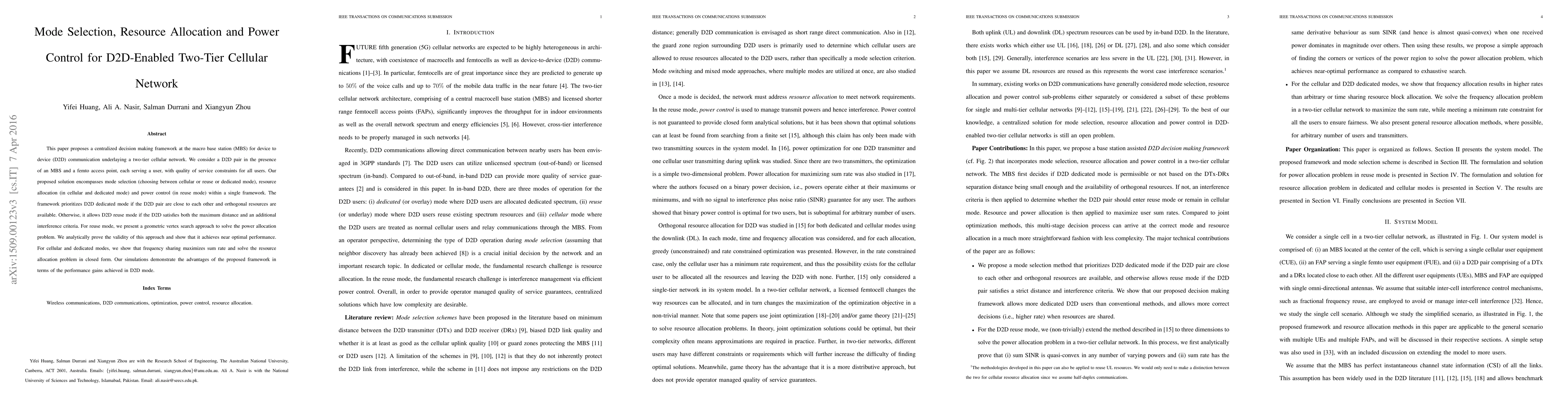 This paper proposes a centralized framework for D2D communication in a two-tier cellular network, addressing mode selection, resource allocation, and power control. The framework prioritizes D2D dedicated mode when resources are available and users are close, while using a geometric vertex search for power control in reuse mode to achieve near-optimal performance.