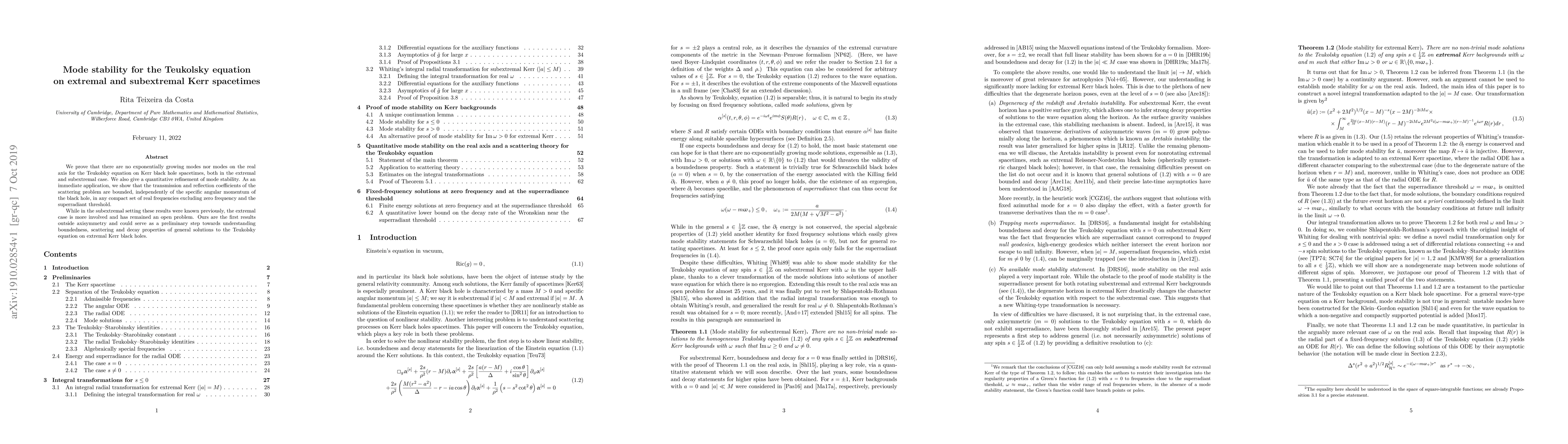 This paper proves the absence of exponentially growing modes and real-axis modes for the Teukolsky equation on both extremal and subextremal Kerr black hole spacetimes, providing a quantitative refinement of mode stability. It also establishes bounded transmission and reflection coefficients for the scattering problem, independent of the black hole's angular momentum, within a specified frequency range.