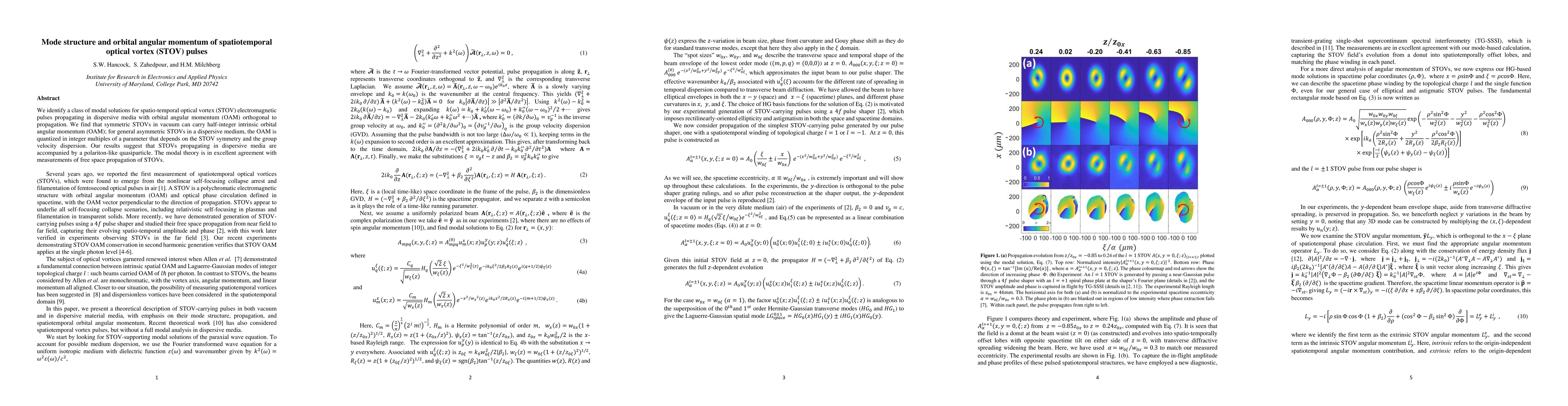 This paper identifies modal solutions for spatio-temporal optical vortex (STOV) pulses, revealing that symmetric STOVs in vacuum carry half-integer orbital angular momentum, while asymmetric STOVs in dispersive media carry quantized integer OAM. The findings suggest a polariton-like quasiparticle accompanies STOVs in dispersive media.