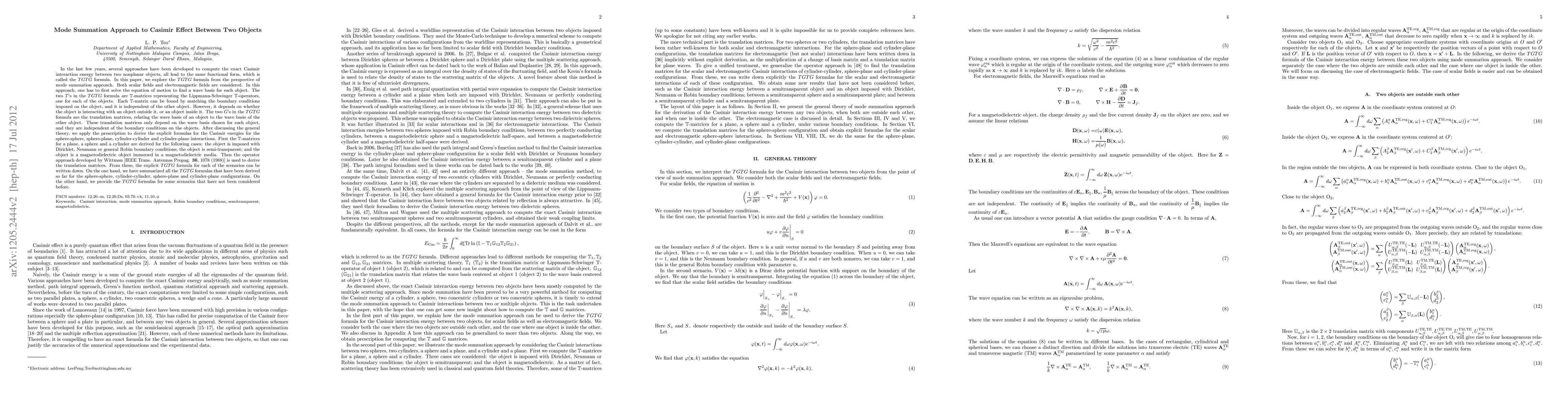 In this paper, we explore the TGTG formula from the perspective of mode summation approach. Both scalar fields and electromagnetic fields are considered. In this approach, one has to first solve the equation of motion to find a wave basis for each object. The two T's in the TGTG formula are T-matrices representing the Lippmann-Schwinger T-operators, one for each of the objects. The two G's in the TGTG formula are the translation matrices, relating the wave basis of an object to the wave basis of the other object. After discussing the general theory, we apply the prescription to derive the explicit formulas for the Casimir energies for the sphere-sphere, sphere-plane, cylinder-cylinder and cylinder-plane interactions. First the T-matrices for a plane, a sphere and a cylinder are derived for the following cases: the object is imposed with general Robin boundary conditions; the object is semitransparent; and the object is magnetodielectric. Then the operator approach is used to derive the translation matrices. From these, the explicit TGTG formula for each of the scenarios can be written down. Besides summarizing all the TGTG formulas that have been derived so far, we also provide the TGTG formulas for some scenarios that have not been considered before.