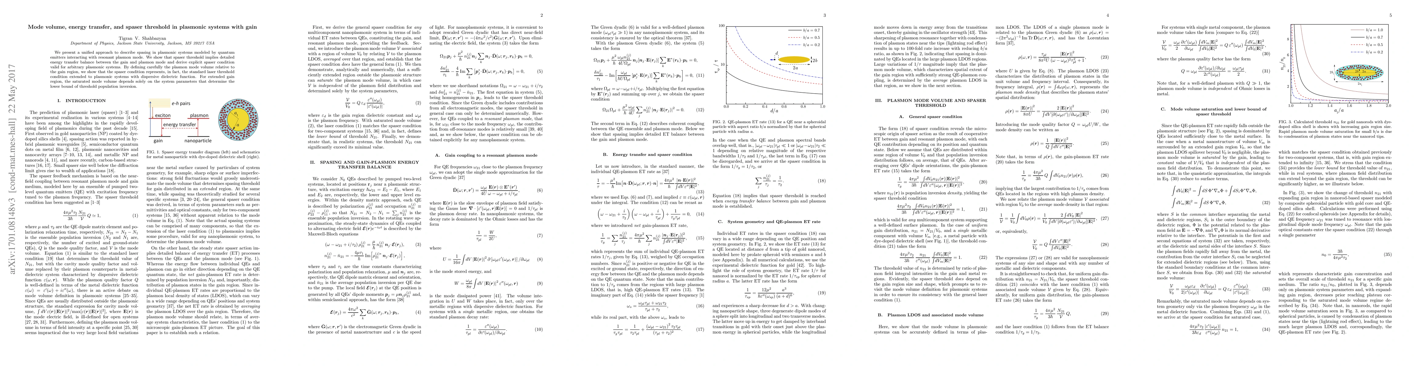 We present a unified approach to describe spasing in plasmonic systems modeled by quantum emitters interacting with resonant plasmon mode. We show that spaser threshold implies detailed energy transfer balance between the gain and plasmon mode and derive explicit spaser condition valid for arbitrary plasmonic systems. By defining carefully the plasmon mode volume relative to the gain region, we show that the spaser condition represents, in fact, the standard laser threshold condition extended to plasmonic systems with dispersive dielectric function. For extended gain region, the saturated mode volume depends solely on the system parameters that determine the lower bound of threshold population inversion.