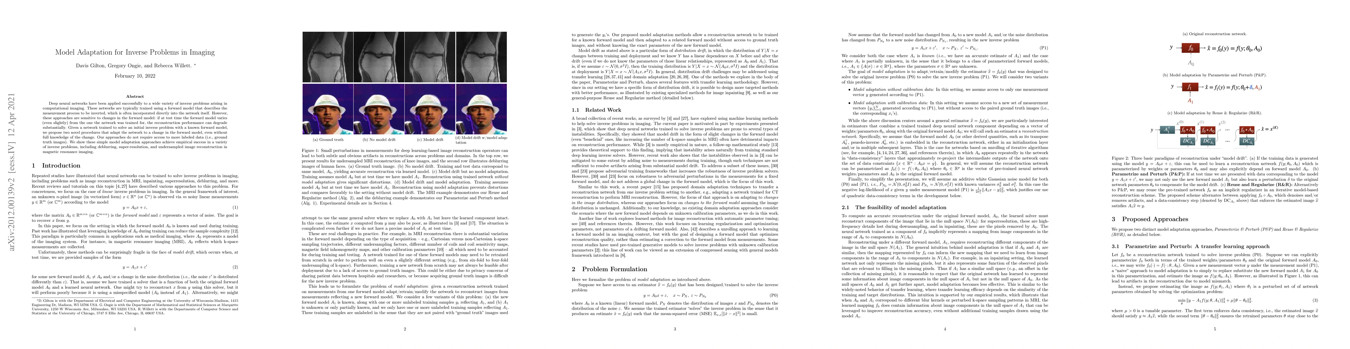 Deep neural networks have been applied successfully to a wide variety of inverse problems arising in computational imaging. These networks are typically trained using a forward model that describes the measurement process to be inverted, which is often incorporated directly into the network itself. However, these approaches are sensitive to changes in the forward model: if at test time the forward model varies (even slightly) from the one the network was trained for, the reconstruction performance can degrade substantially. Given a network trained to solve an initial inverse problem with a known forward model, we propose two novel procedures that adapt the network to a change in the forward model, even without full knowledge of the change. Our approaches do not require access to more labeled data (i.e., ground truth images). We show these simple model adaptation approaches achieve empirical success in a variety of inverse problems, including deblurring, super-resolution, and undersampled image reconstruction in magnetic resonance imaging.