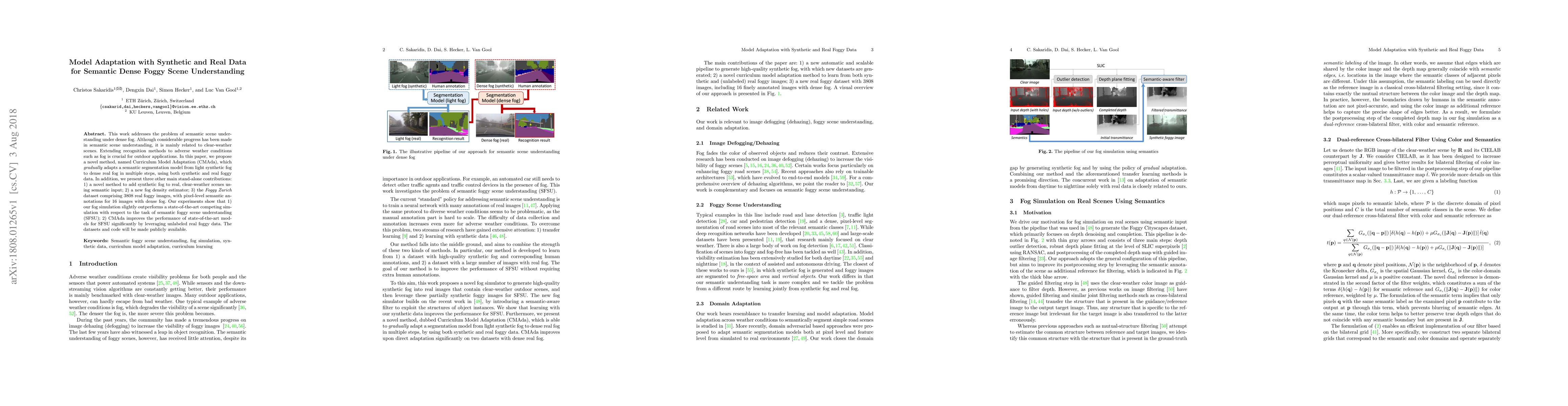 This paper proposes Curriculum Model Adaptation (CMAda) to enhance semantic scene understanding in dense fog, utilizing both synthetic and real foggy data. The authors also introduce a fog density estimator, a new fog simulation method, and the Foggy Zurich dataset, demonstrating significant improvements over state-of-the-art methods for semantic foggy scene understanding.