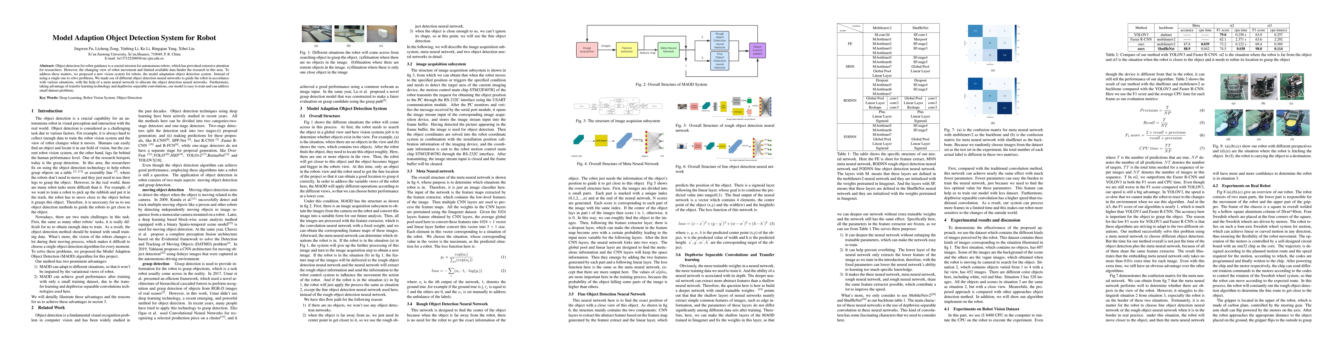 Object detection for robot guidance is a crucial mission for autonomous robots, which has provoked extensive attention for researchers. However, the changing view of robot movement and limited available data hinder the research in this area. To address these matters, we proposed a new vision system for robots, the model adaptation object detection system. Instead of using a single one to solve problems, We made use of different object detection neural networks to guide the robot in accordance with various situations, with the help of a meta neural network to allocate the object detection neural networks. Furthermore, taking advantage of transfer learning technology and depthwise separable convolutions, our model is easy to train and can address small dataset problems.