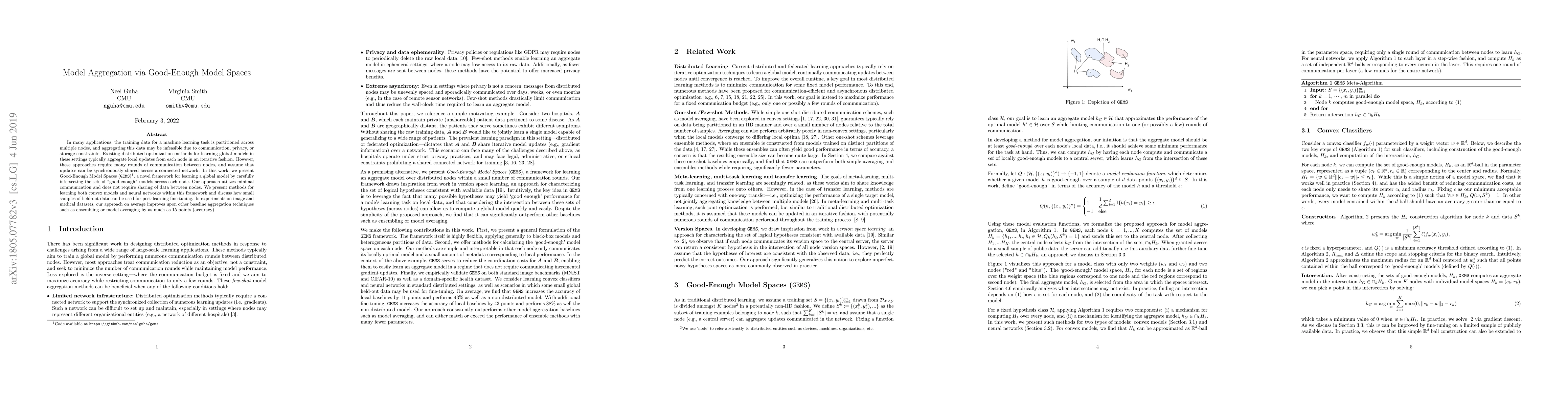 In many applications, the training data for a machine learning task is partitioned across multiple nodes, and aggregating this data may be infeasible due to communication, privacy, or storage constraints. Existing distributed optimization methods for learning global models in these settings typically aggregate local updates from each node in an iterative fashion. However, these approaches require many rounds of communication between nodes, and assume that updates can be synchronously shared across a connected network. In this work, we present Good-Enough Model Spaces (GEMS), a novel framework for learning a global model by carefully intersecting the sets of "good-enough" models across each node. Our approach utilizes minimal communication and does not require sharing of data between nodes. We present methods for learning both convex models and neural networks within this framework and discuss how small samples of held-out data can be used for post-learning fine-tuning. In experiments on image and medical datasets, our approach on average improves upon other baseline aggregation techniques such as ensembling or model averaging by as much as 15 points (accuracy).