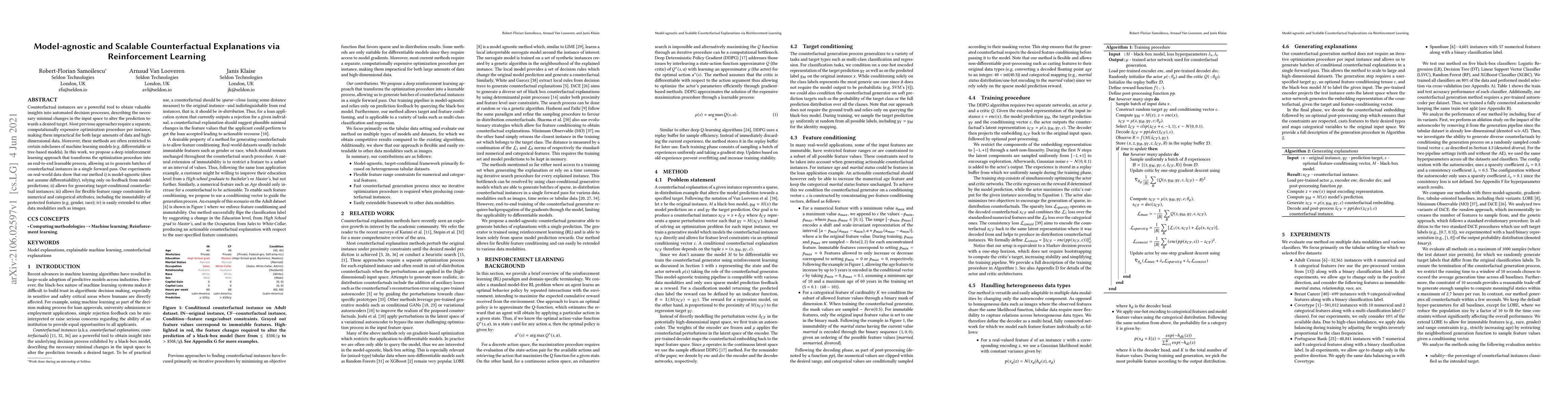 This paper proposes a scalable, model-agnostic counterfactual explanation method using deep reinforcement learning, enabling efficient generation of counterfactual instances for large datasets without requiring model-specific optimization. The approach supports batch processing, feature constraints, and extends to various data modalities.