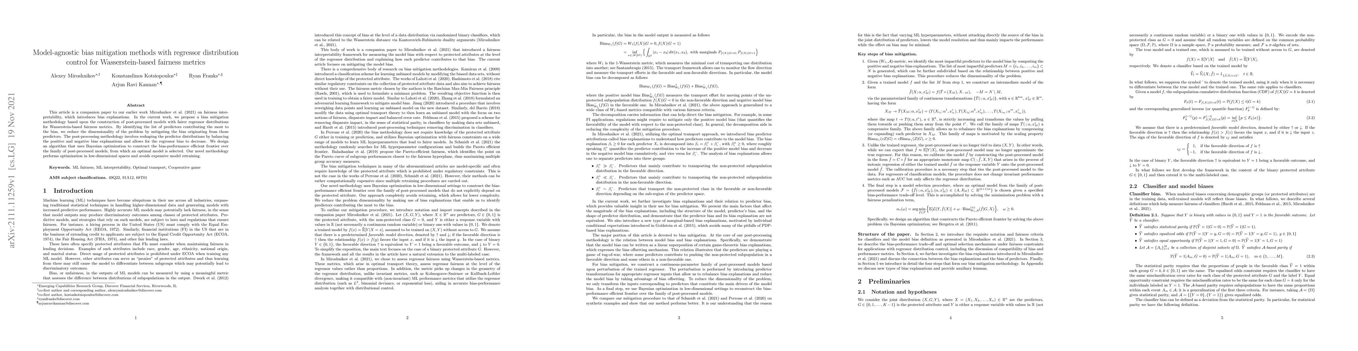 This paper proposes a model-agnostic bias mitigation technique that reshapes predictor distributions to achieve fairer regressor distributions for Wasserstein-based fairness metrics, reducing bias without extensive model retraining. The method uses Bayesian optimization to find an optimal balance between bias reduction and performance.