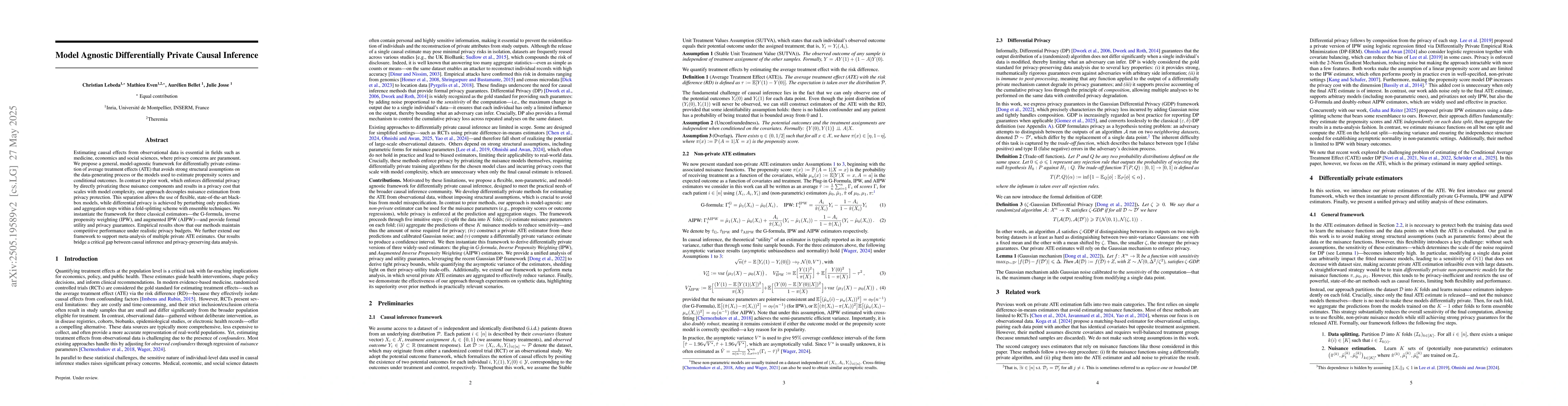 Researchers propose a model-agnostic framework for differentially private causal inference that decouples nuisance estimation from privacy protection, allowing flexible models while maintaining competitive performance under realistic privacy budgets.