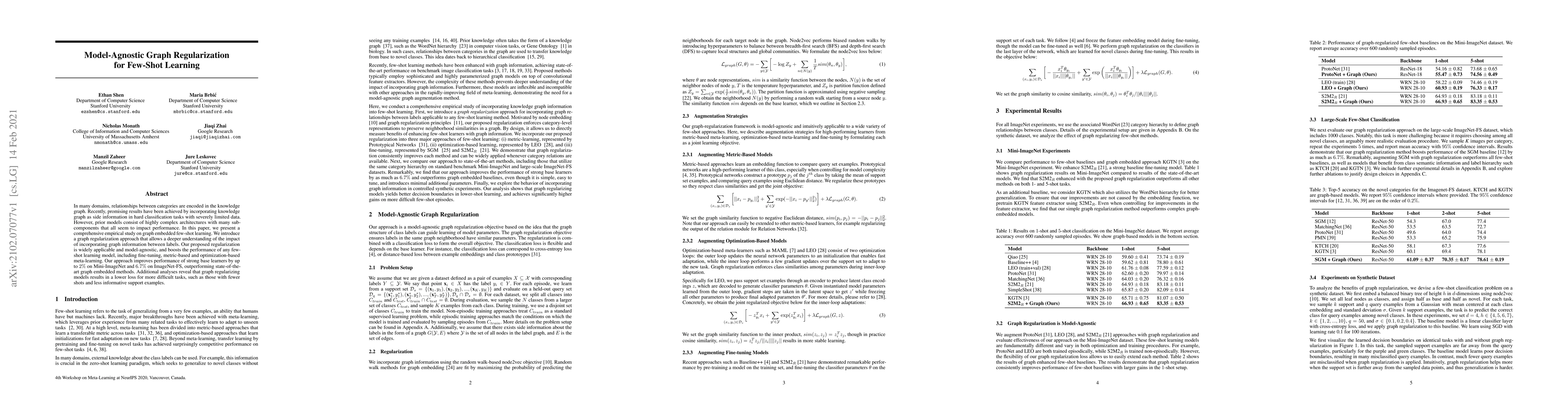 This paper proposes a model-agnostic graph regularization technique to improve few-shot learning performance by incorporating knowledge graph information. The method enhances various few-shot learning models, achieving up to 2% better results on Mini-ImageNet and 6.7% on ImageNet-FS compared to state-of-the-art methods.