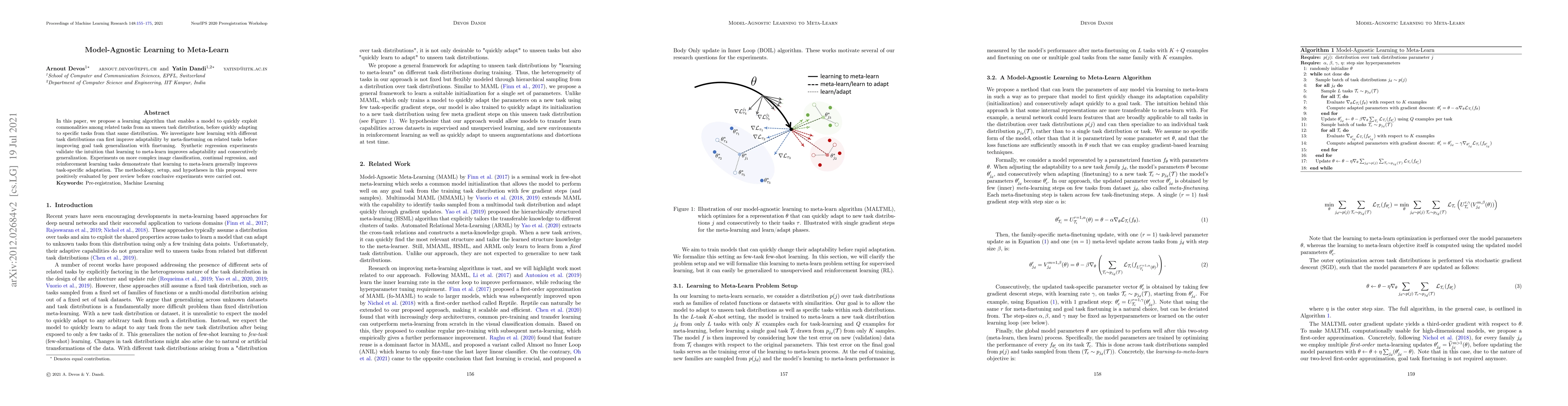 This paper introduces a model-agnostic learning algorithm to enhance adaptability and generalization by meta-learning from related tasks before finetuning on specific tasks. Experiments across various domains show improved task-specific adaptation and generalization through this meta-learning approach.